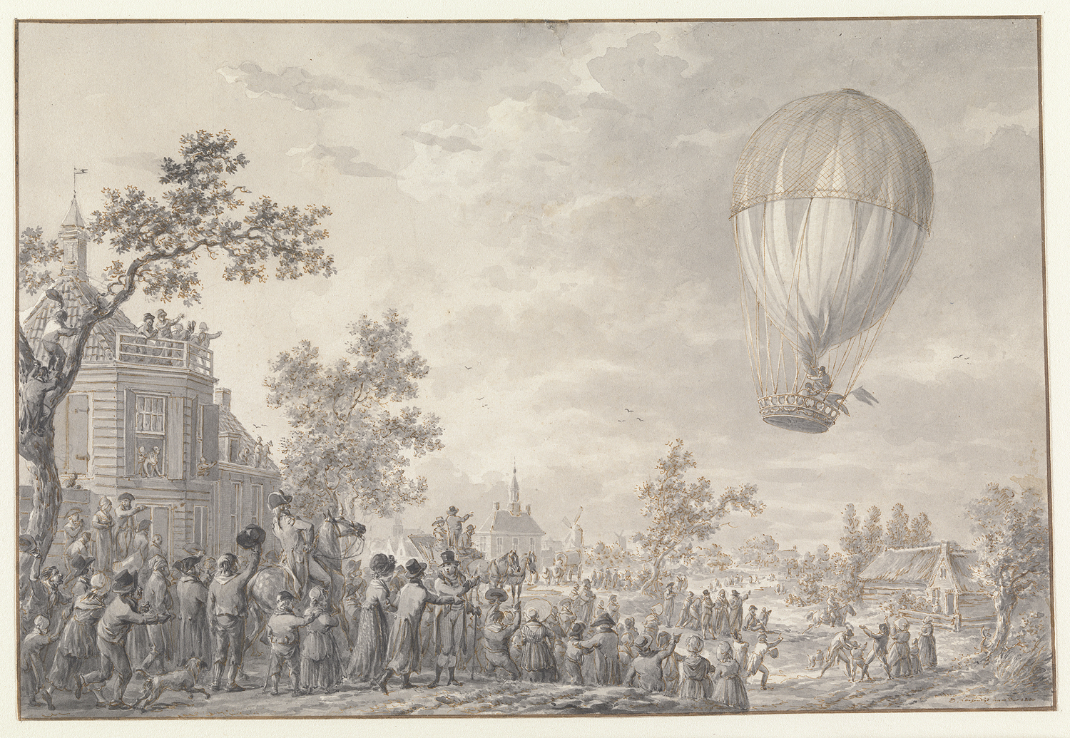 Eene menigte volks ziende naar eene opgaande luchtba...