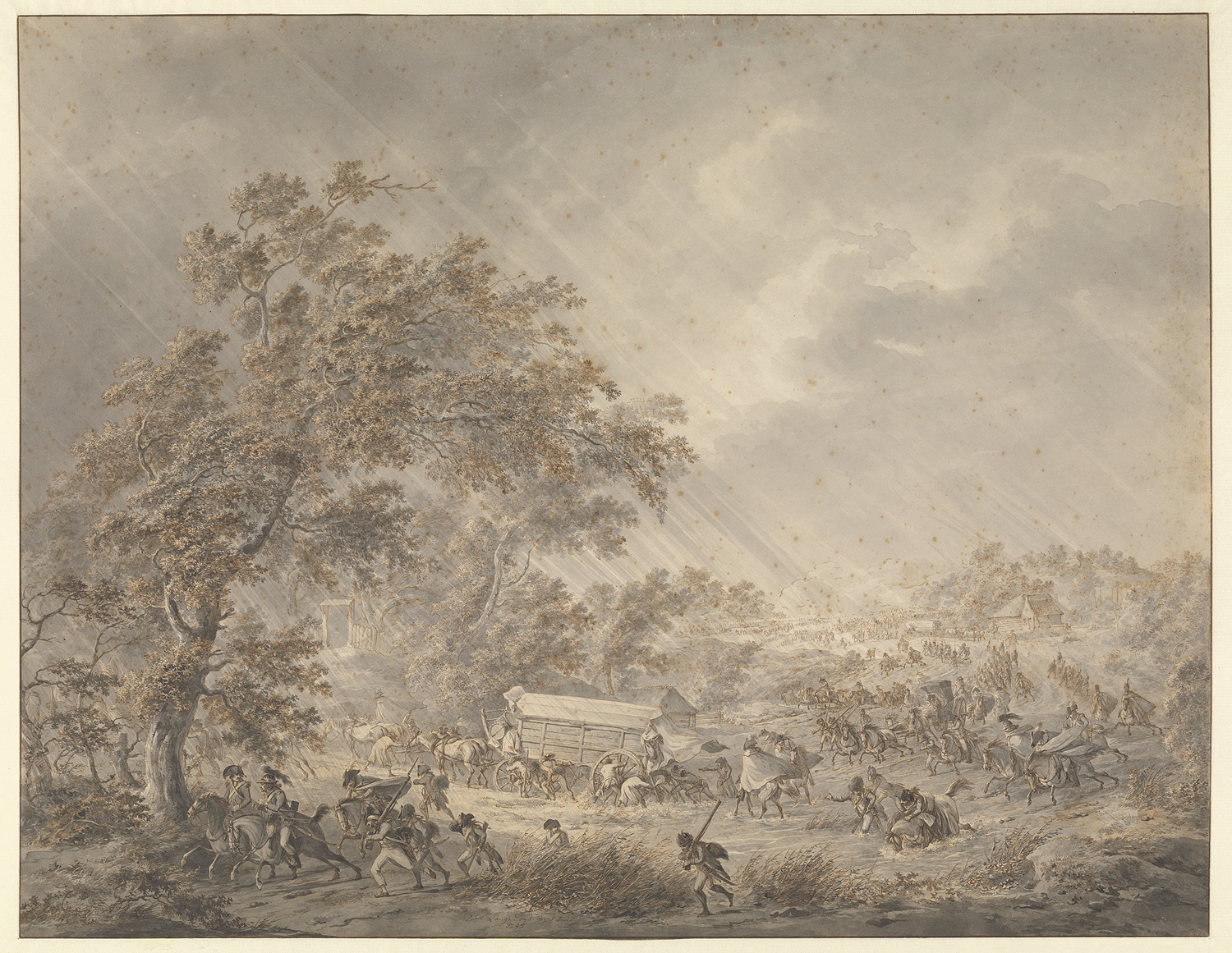 Een vluchtend leger bij stormachtig weer