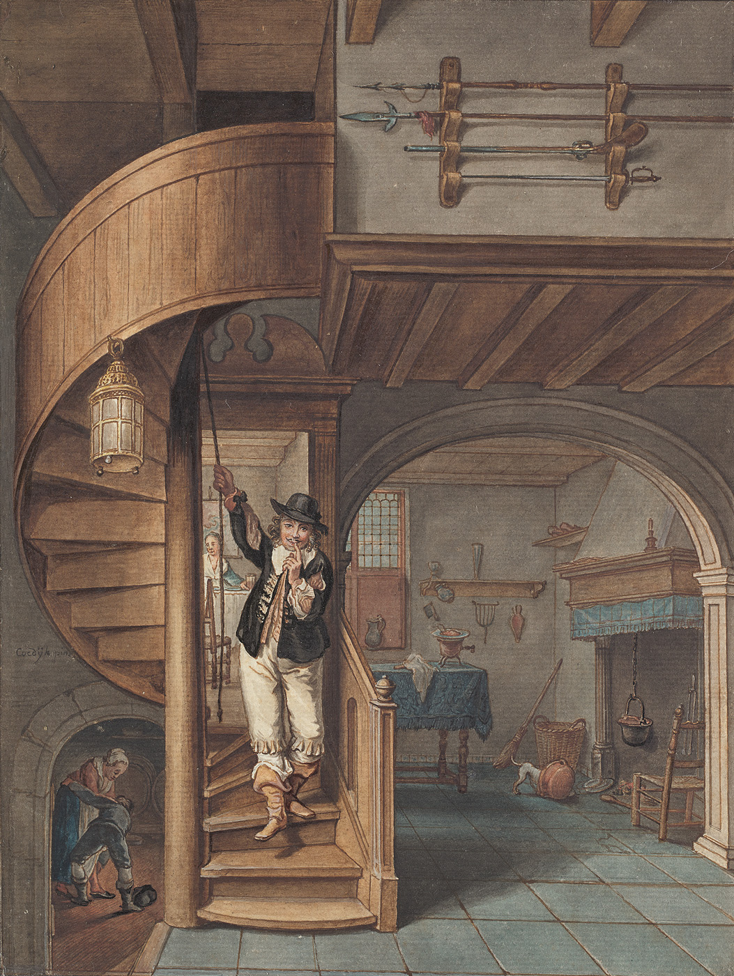 Keukeninterieur met een man die een wenteltrap afloo...