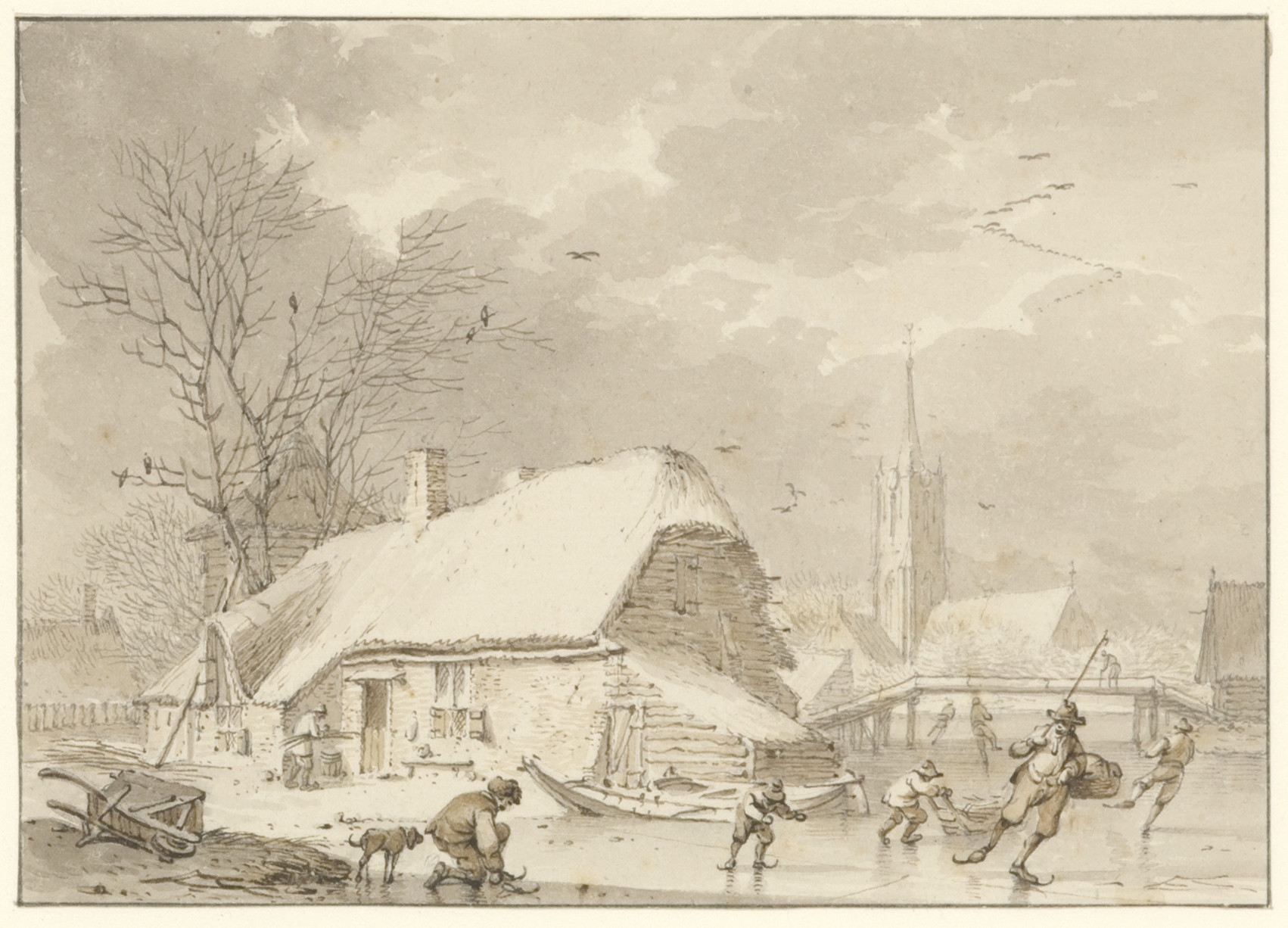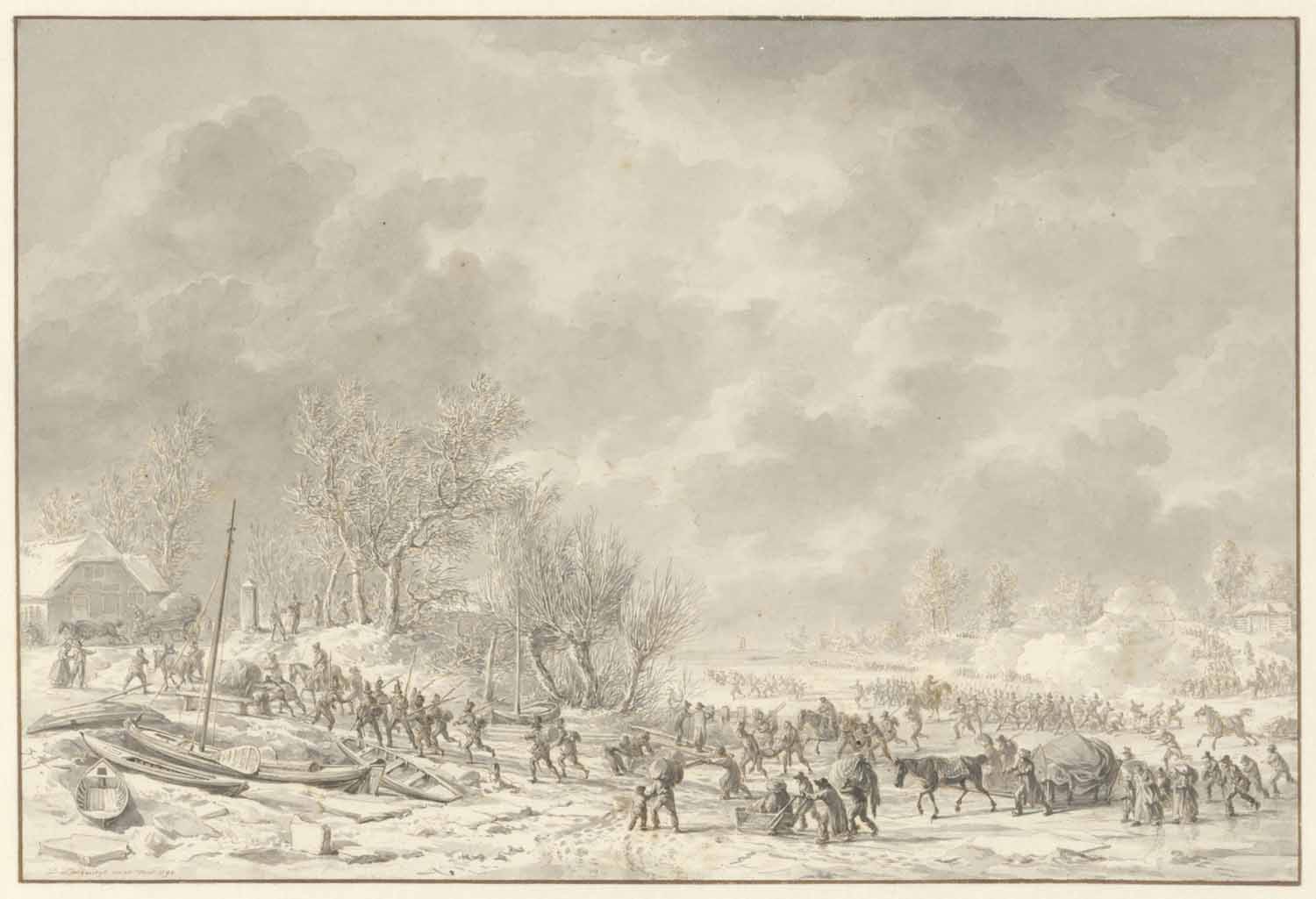 Boeren en militairen vluchtende over een bevroren ri...