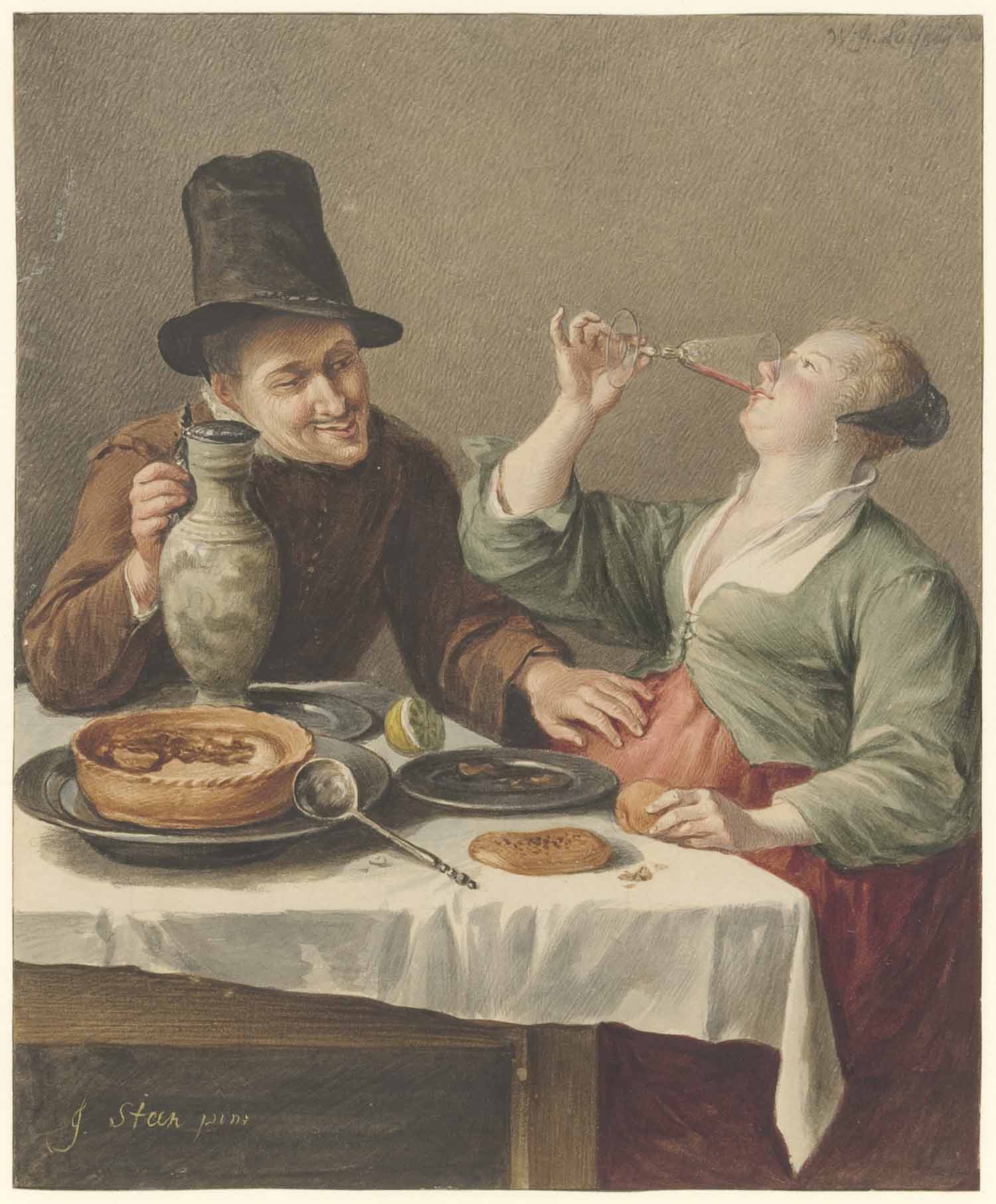 Een smullend paar aan tafel, naar een schilderij van...