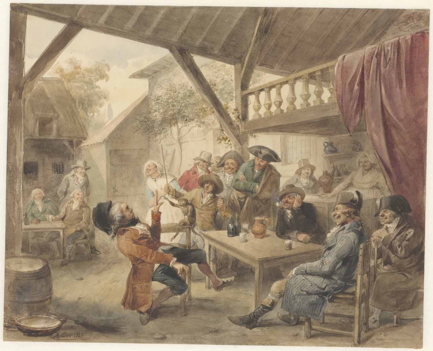 Aan eene tafel buiten eene herberg zitten eenige hee...