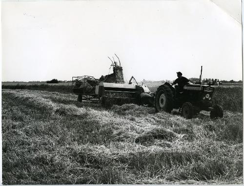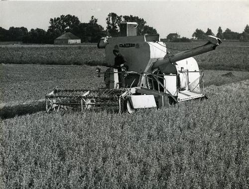 Foto in zwart-wit van een Clayson maaidorser op een ...