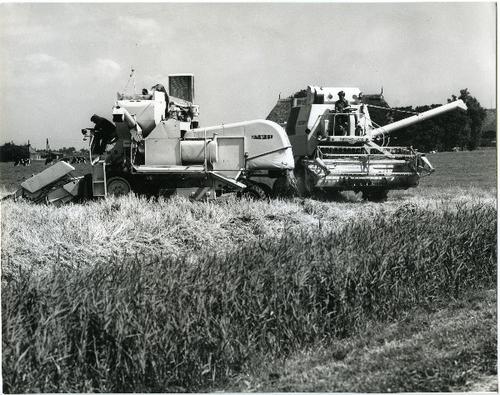 Foto in zwart-wit van twee Clayson maaidorsers op ee...