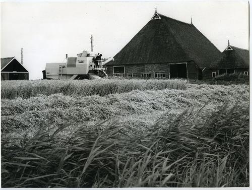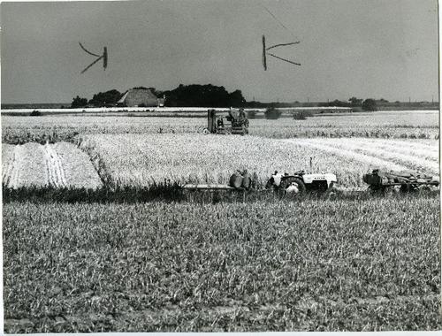Foto in zwart-wit van twee maaidorsers door J.D. de ...