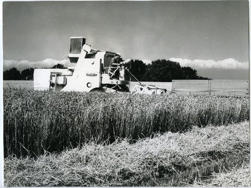 Foto in zwart-wit van een Clayson maaidorsers op een...