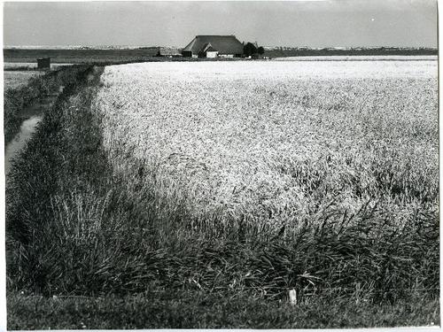 Foto in zwart-wit van een veld met stro door J.D. de...