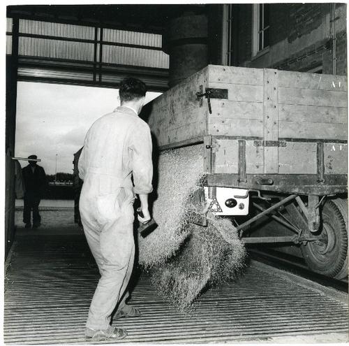 Foto in zwart-wit van de graanontvangst in de silo v...