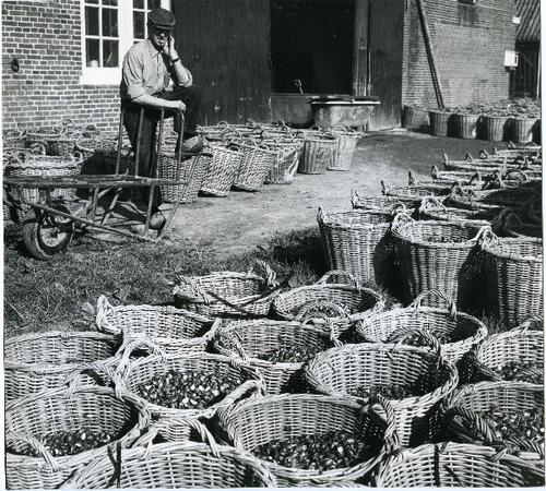 Foto in zwart-wit van rieten manden met tulpenbollen...