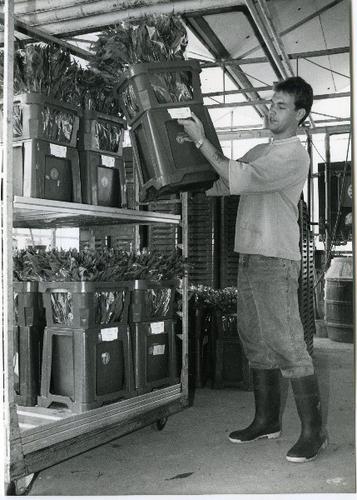 Foto in zwart-wit van het inpakken van alstroemeria'...