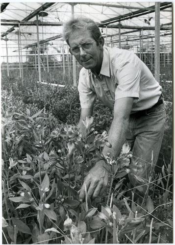 Foto in zwart-wit van kassen met alstroemeria's door...