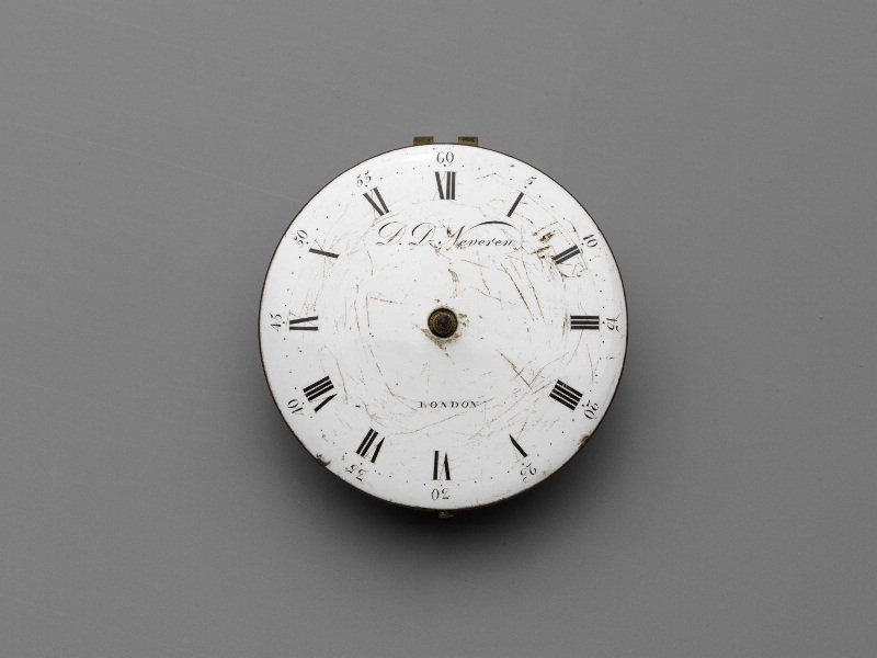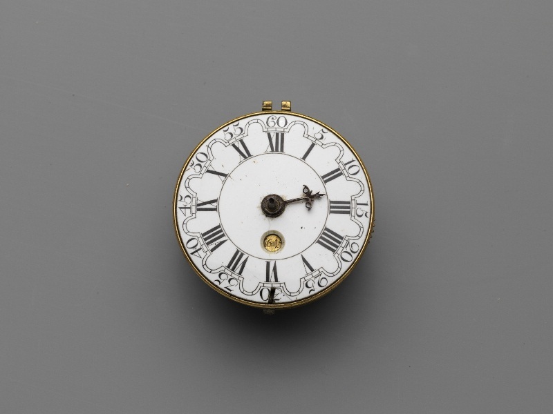 Rond horloge met witte emaille wijzerplaat, waarop i...