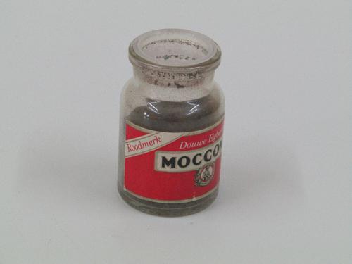 Potje Moccona, proefmonster flesje met poederkoffie.