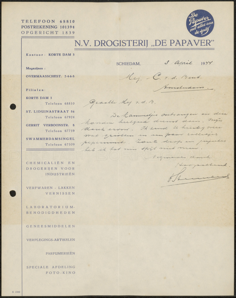 Brief aan Mej C.v.d. Bent van 3 april 1944