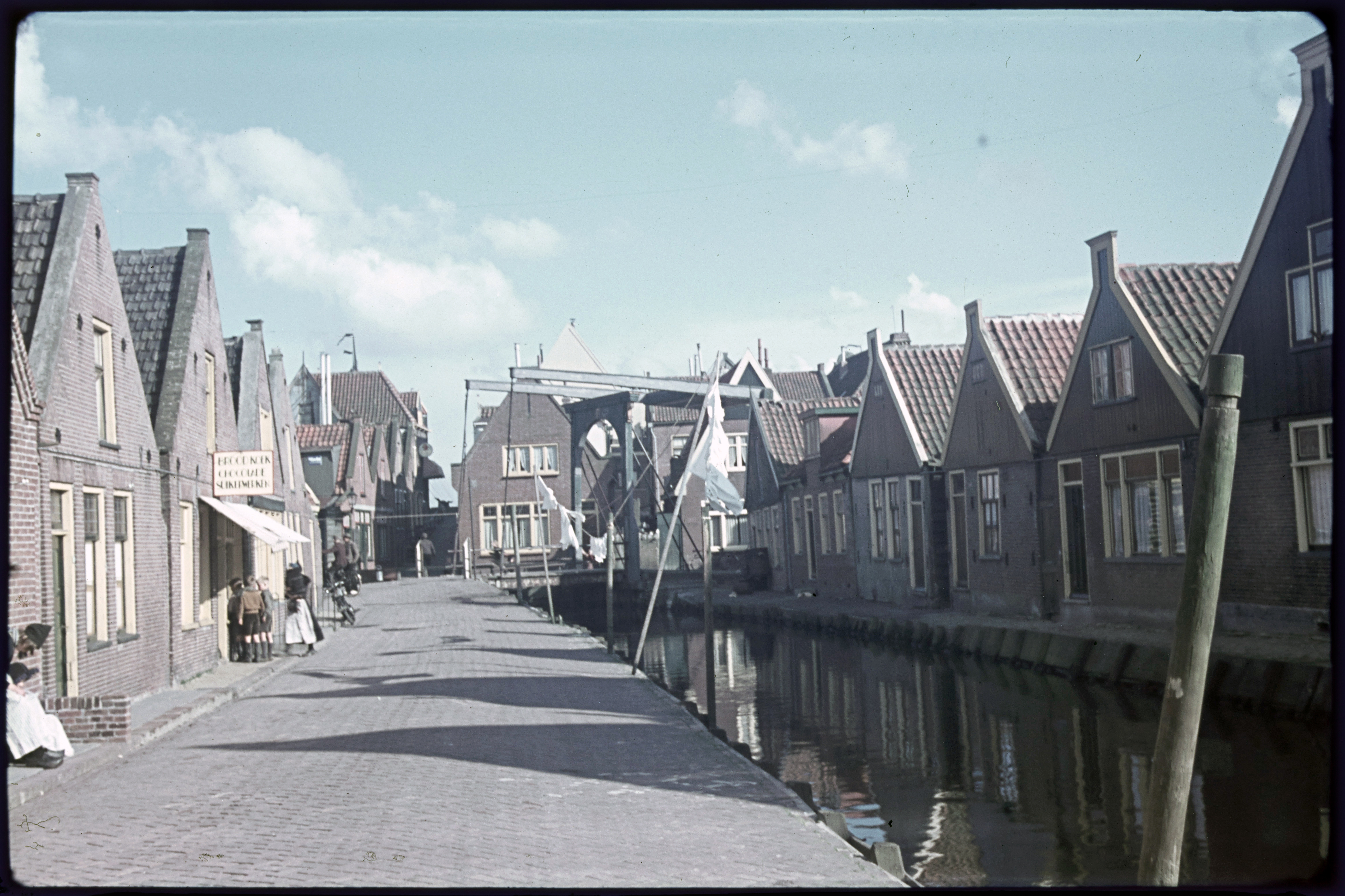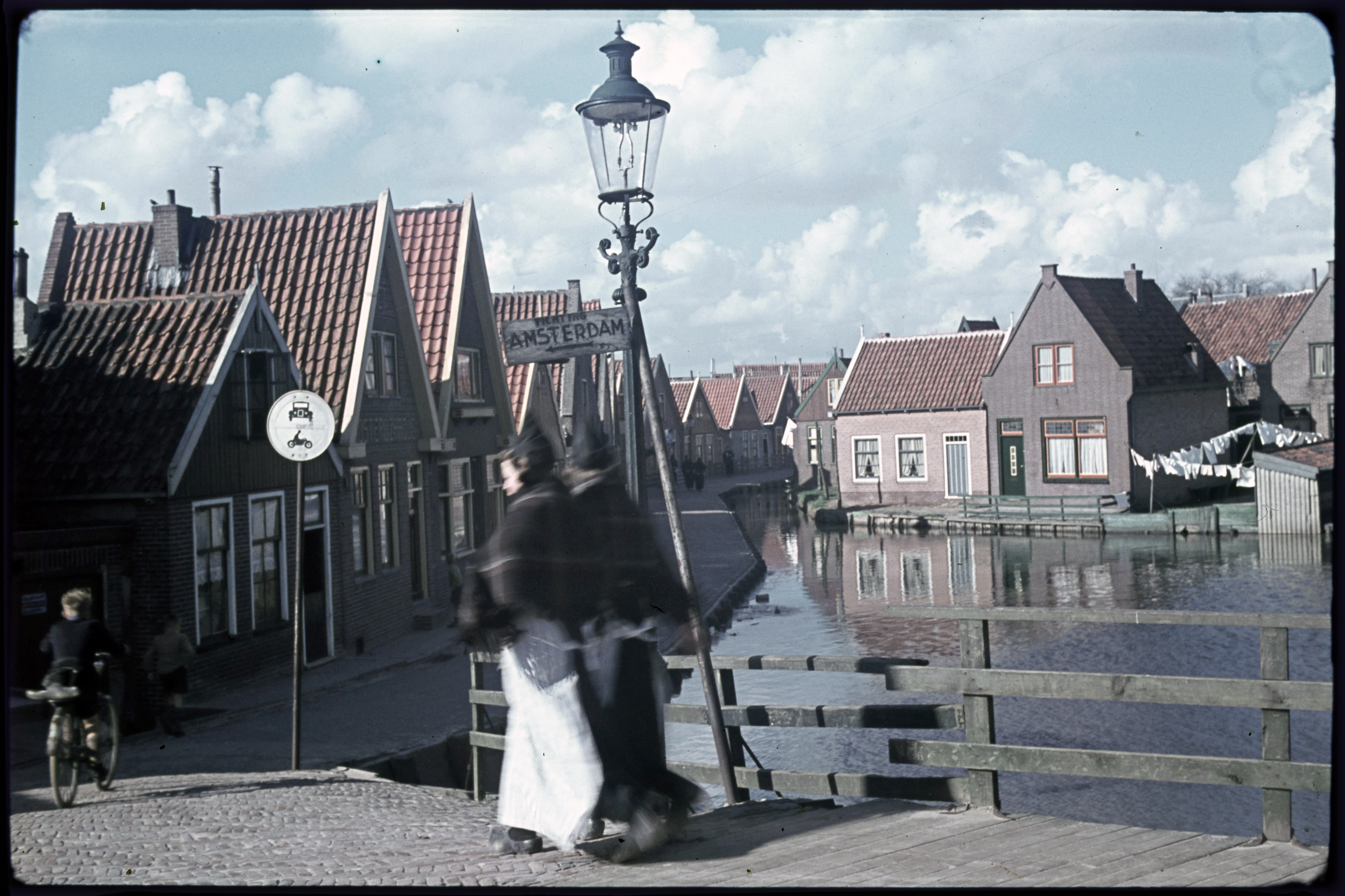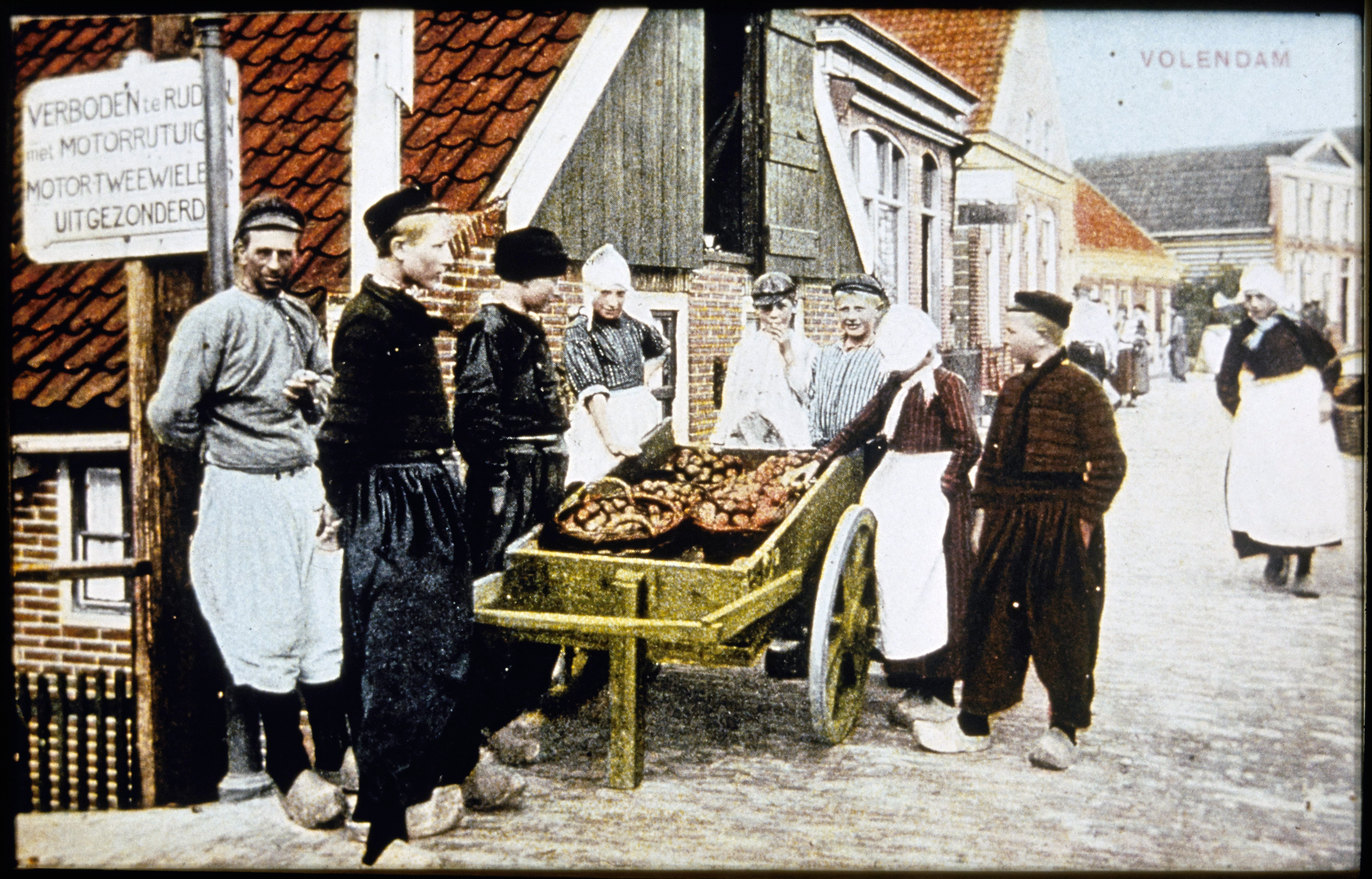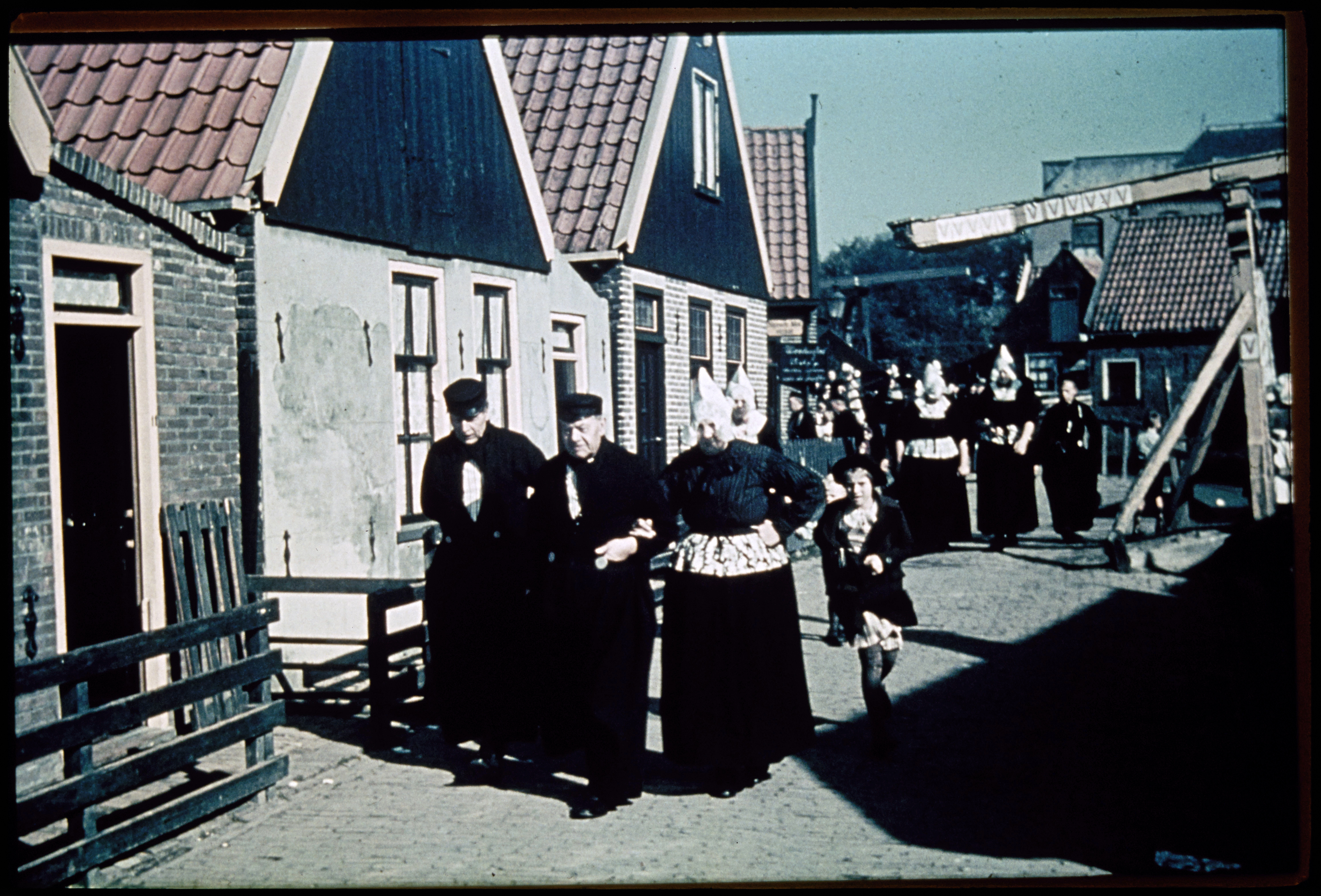Straatbeeld met volendammers in dracht