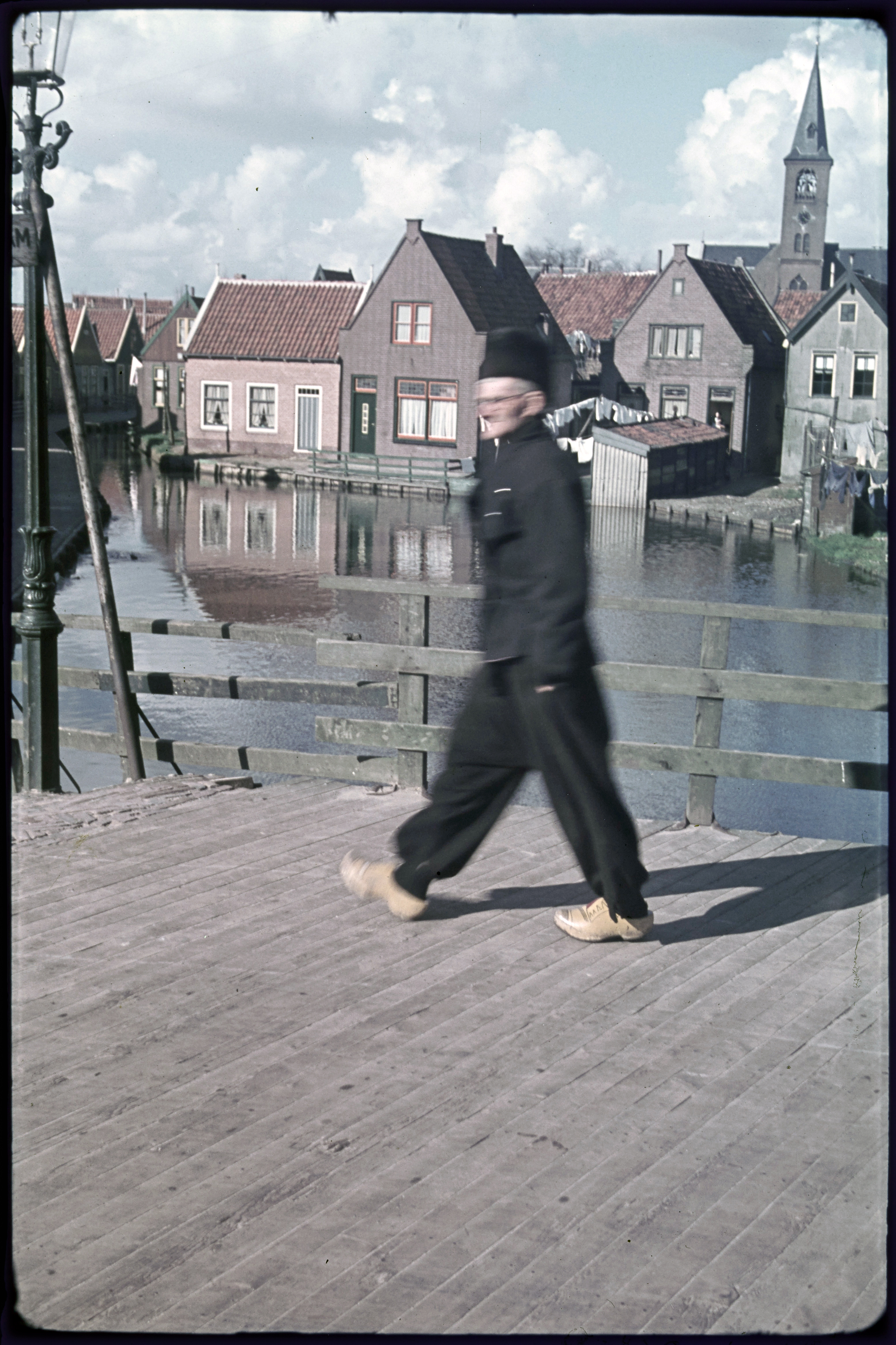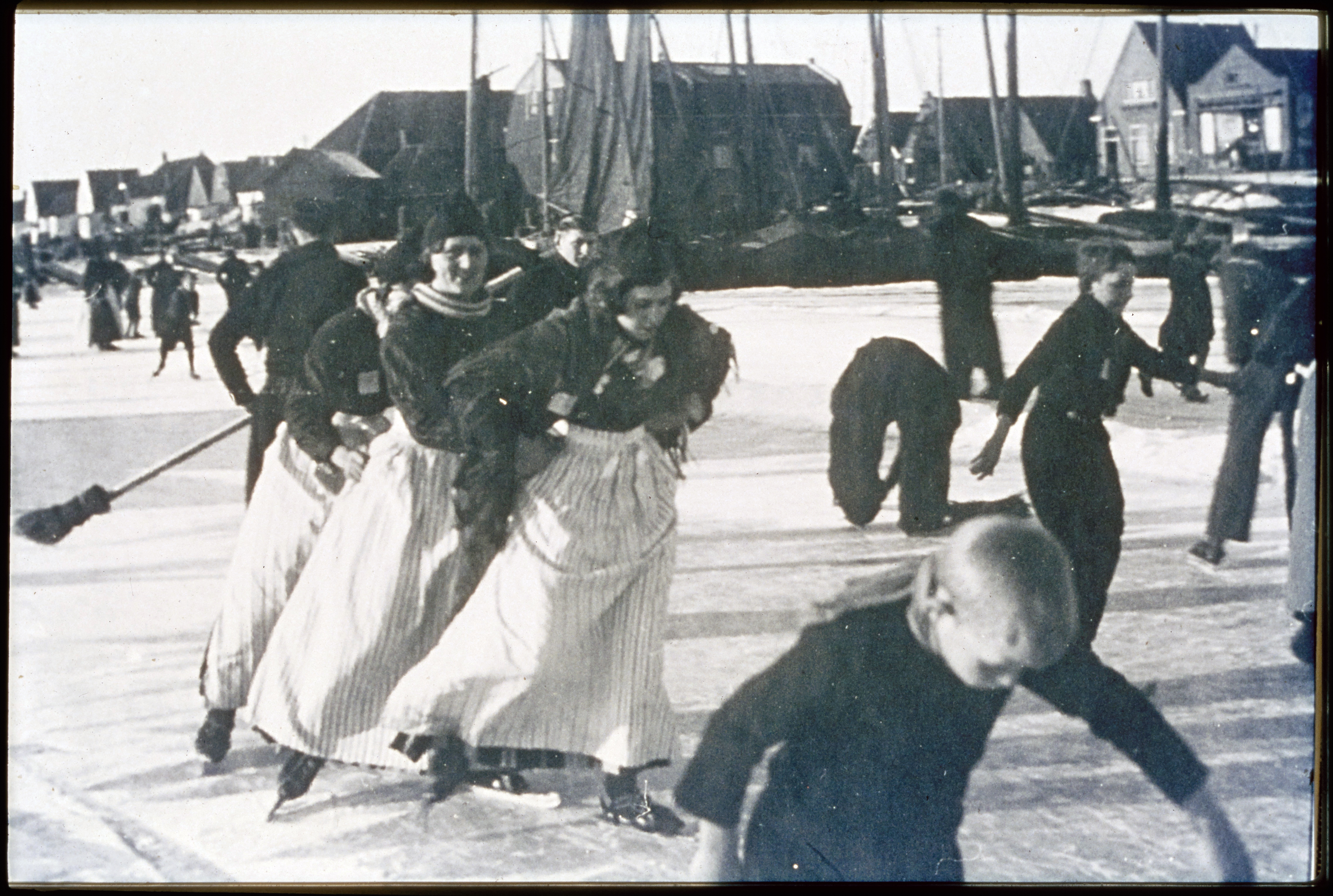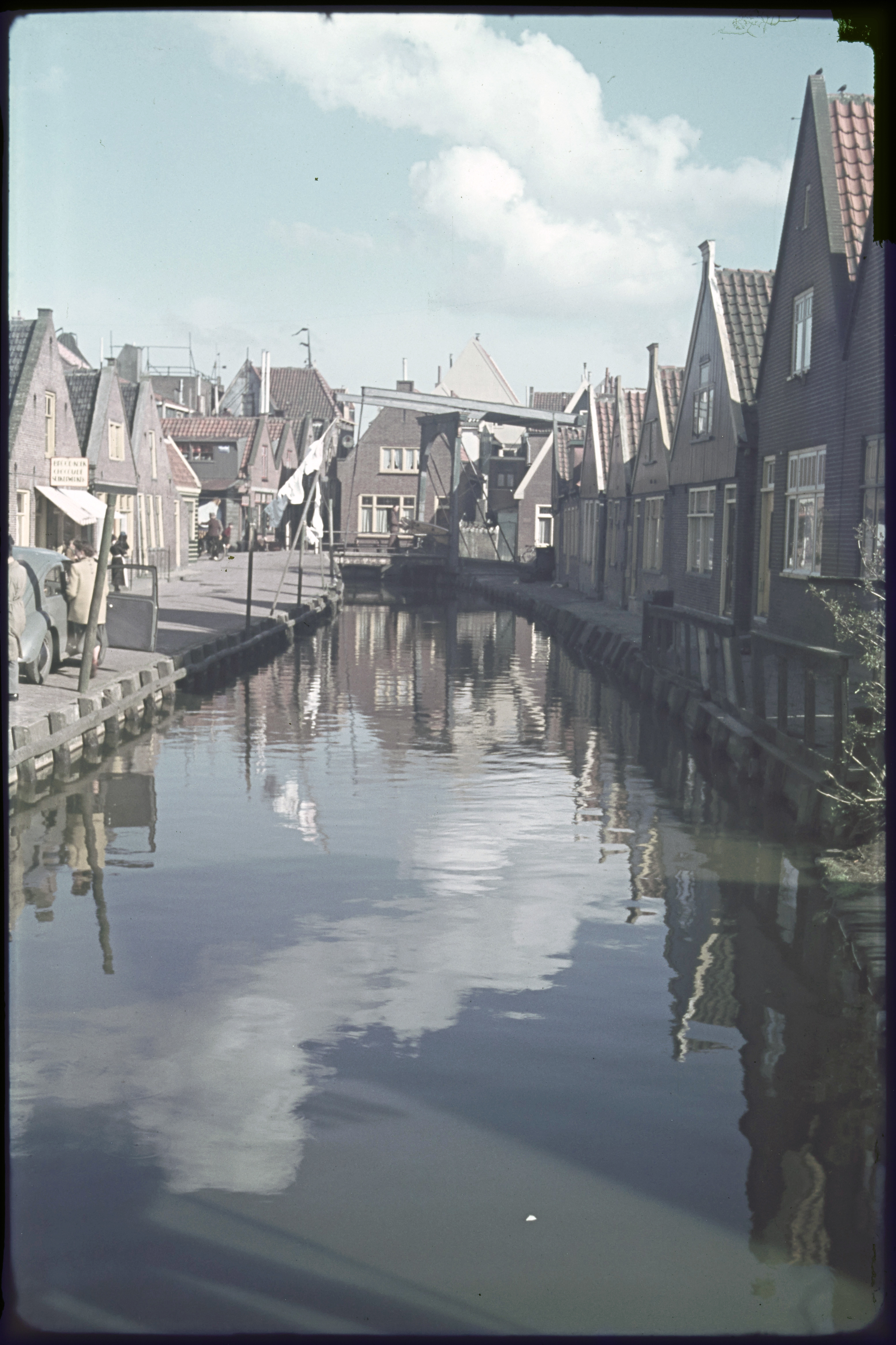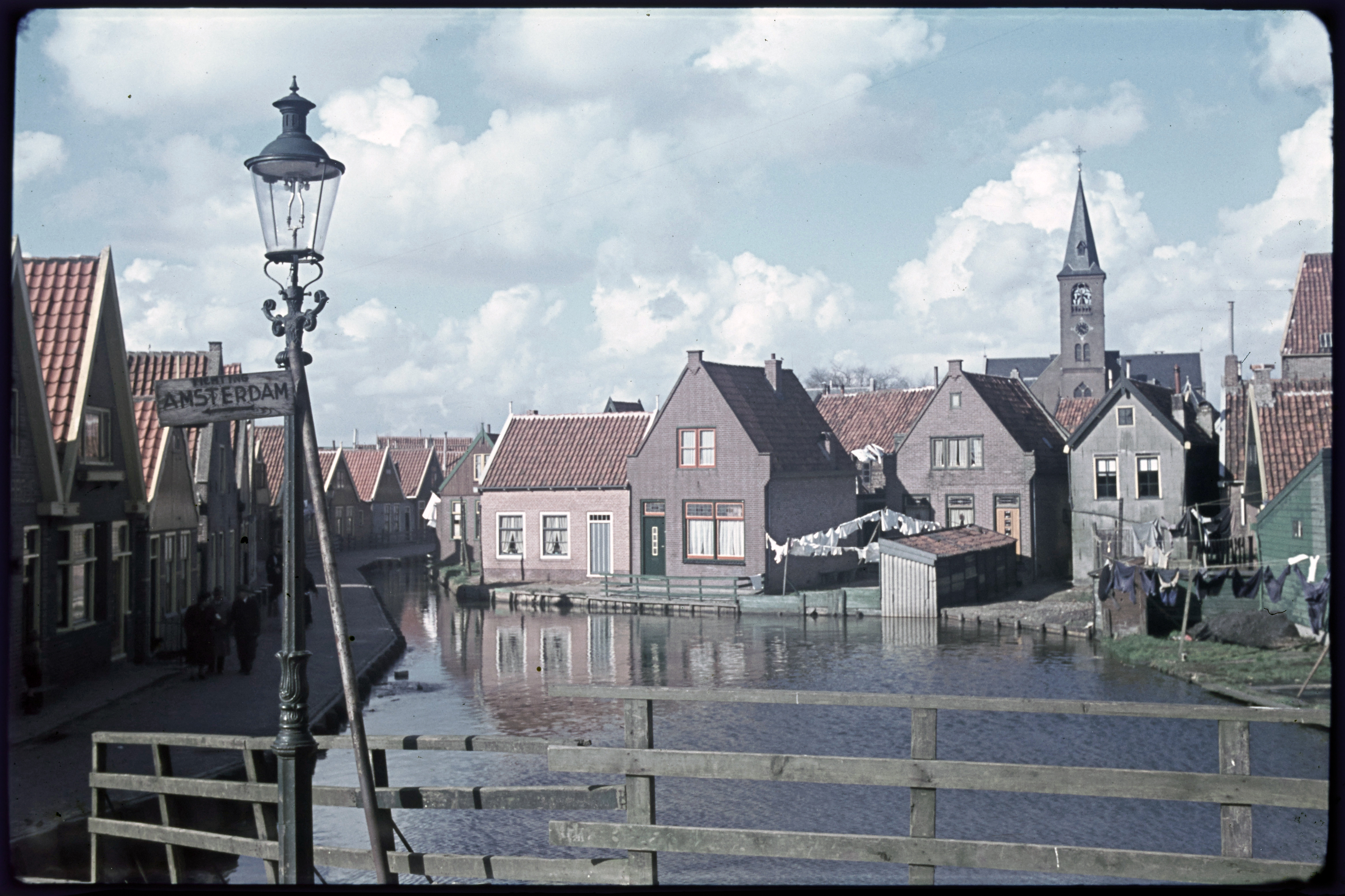 Straatbeeld met volendammers in dracht