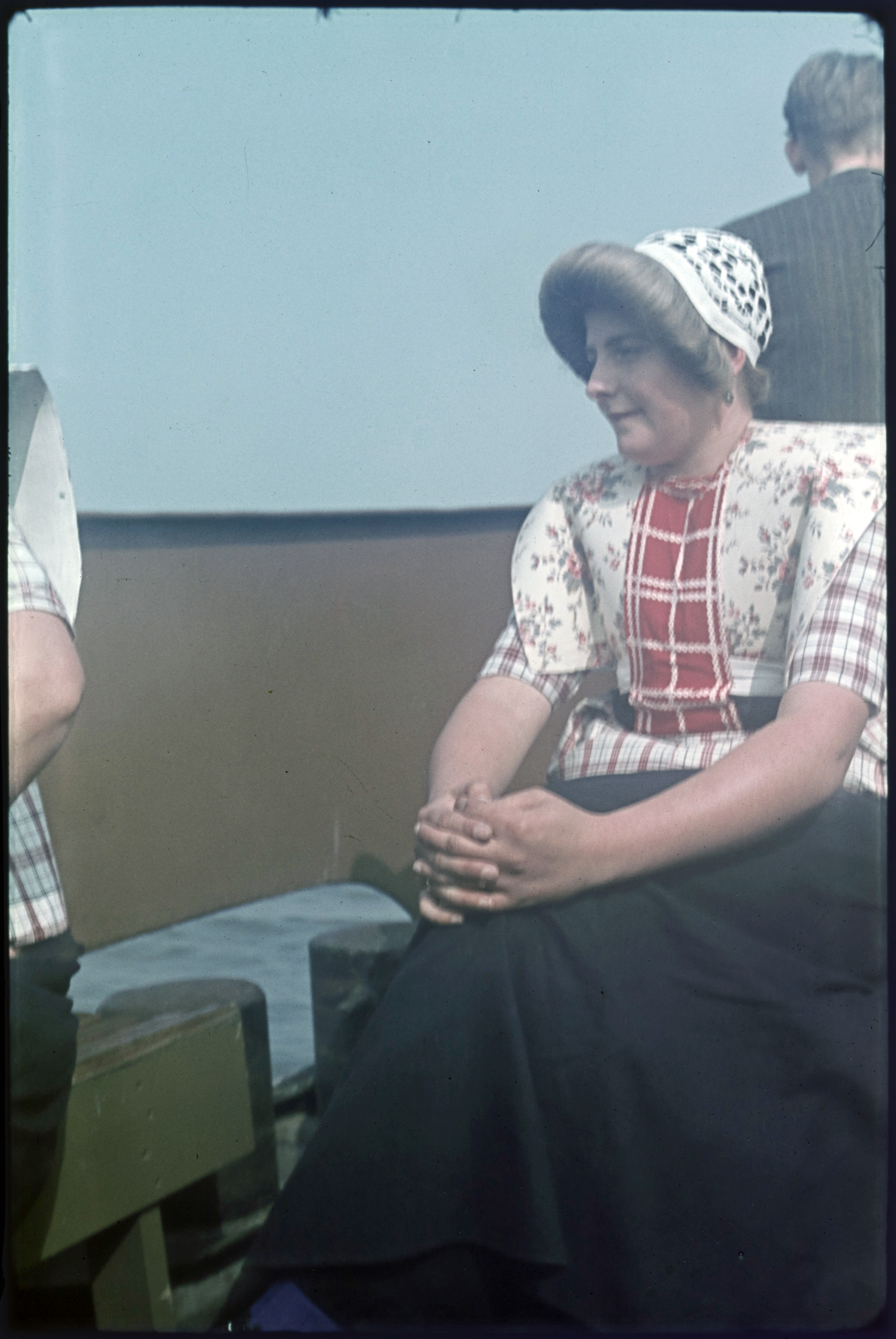 Vrouw met twee meisjes in klederdracht bij de haven