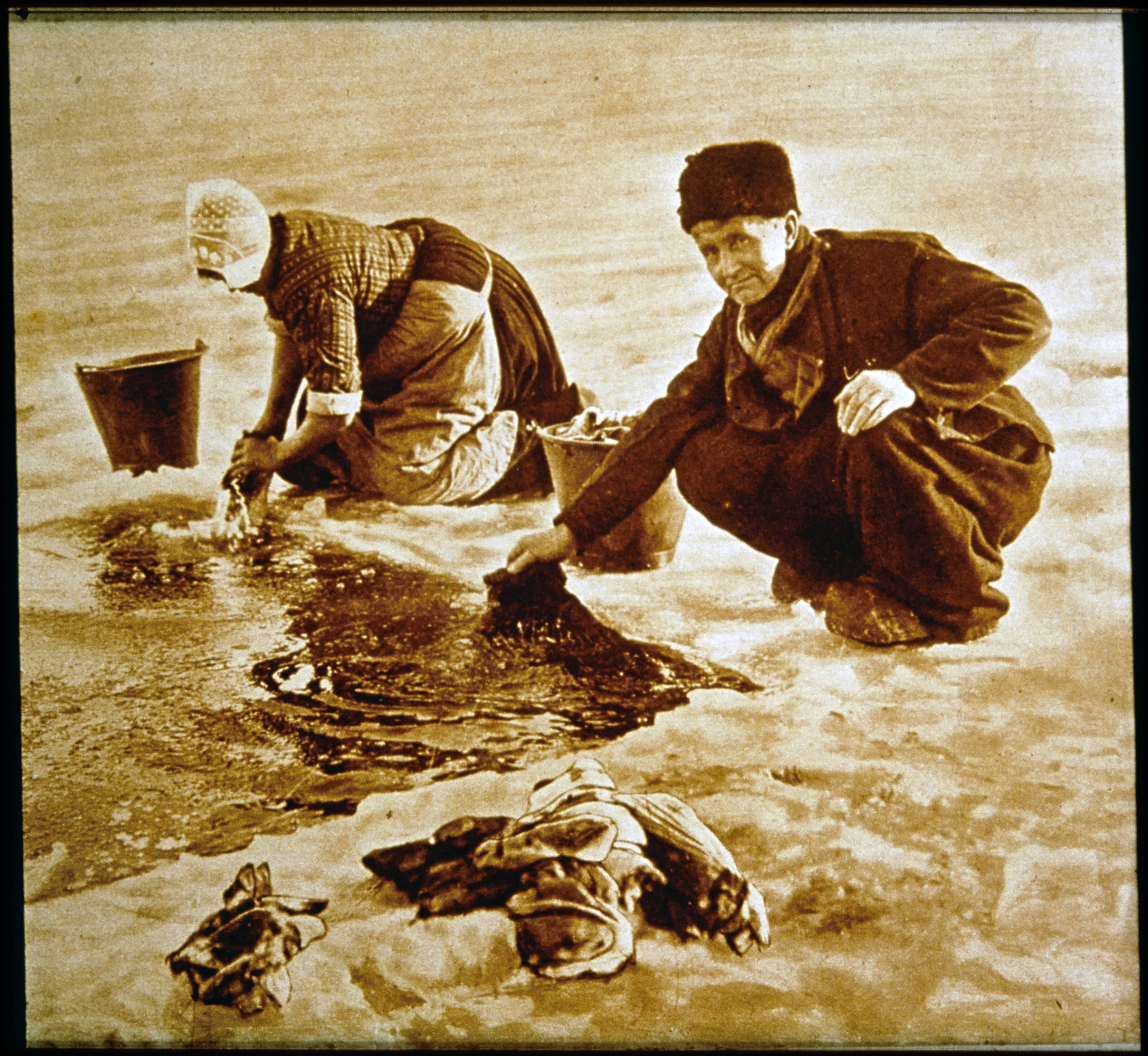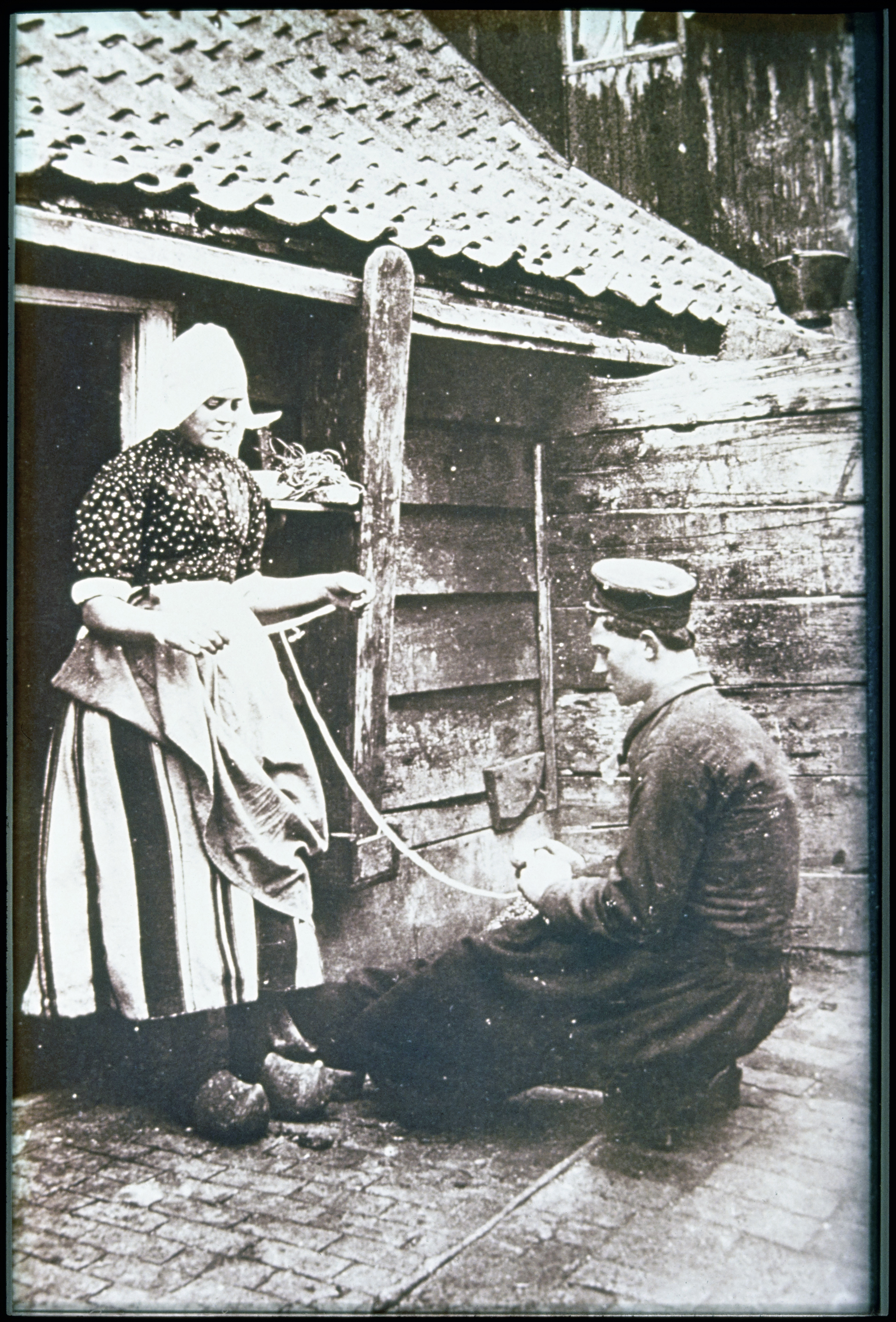 Straatbeeld met Volendammers en emmer in dracht