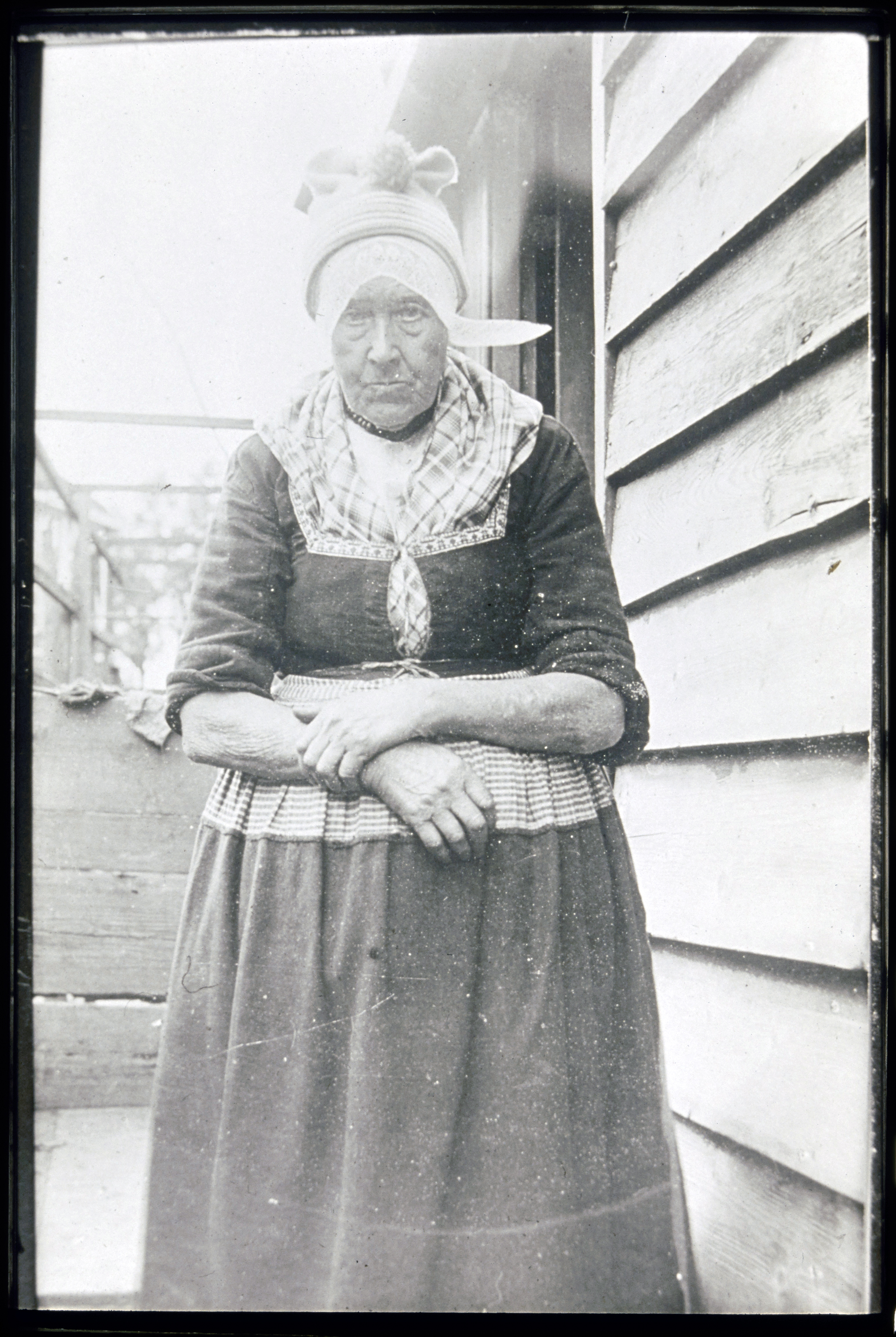 Volendammer vrouw vóór woning
