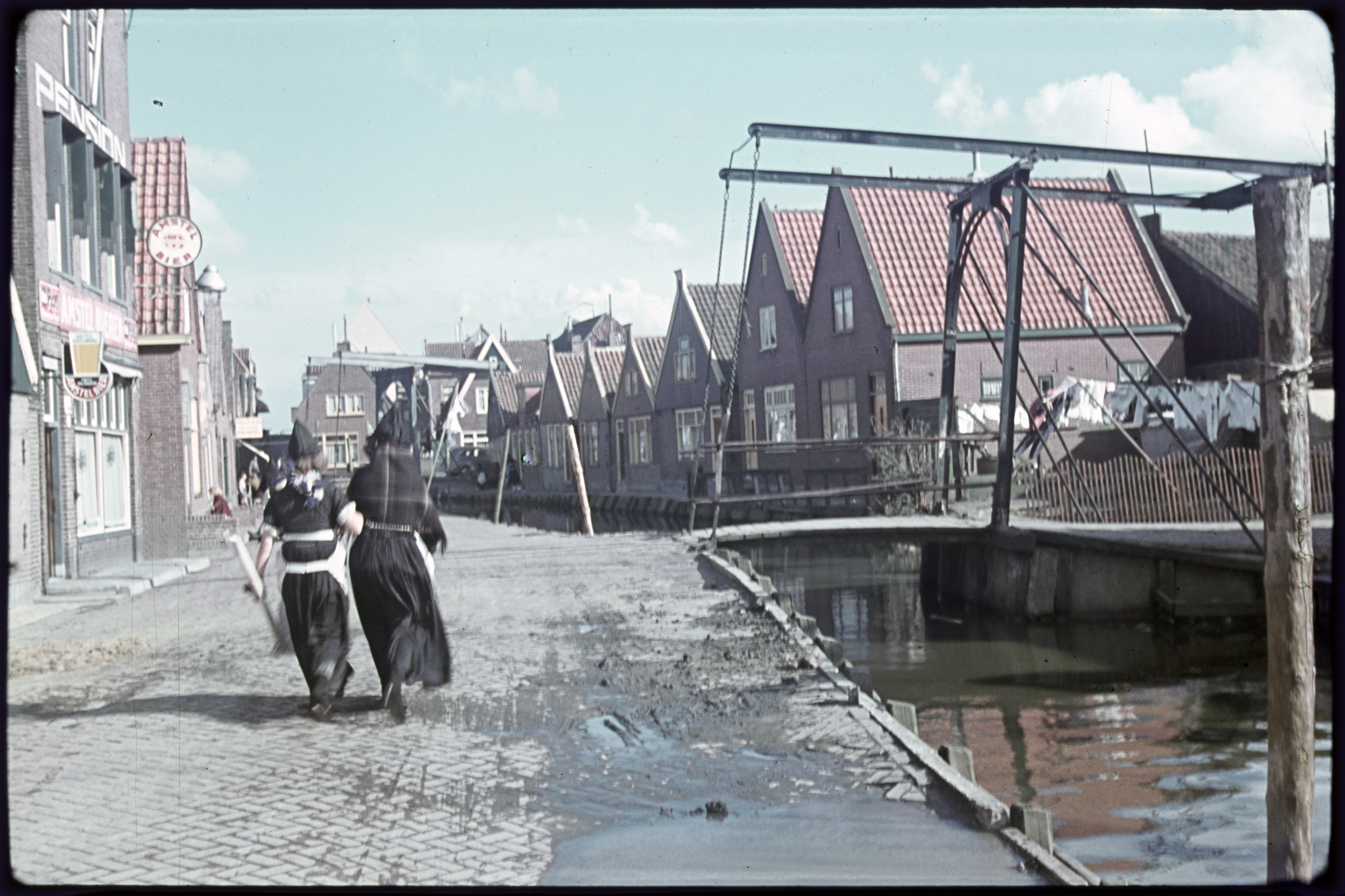Straatbeeld met volendammer meisjes in klederdracht