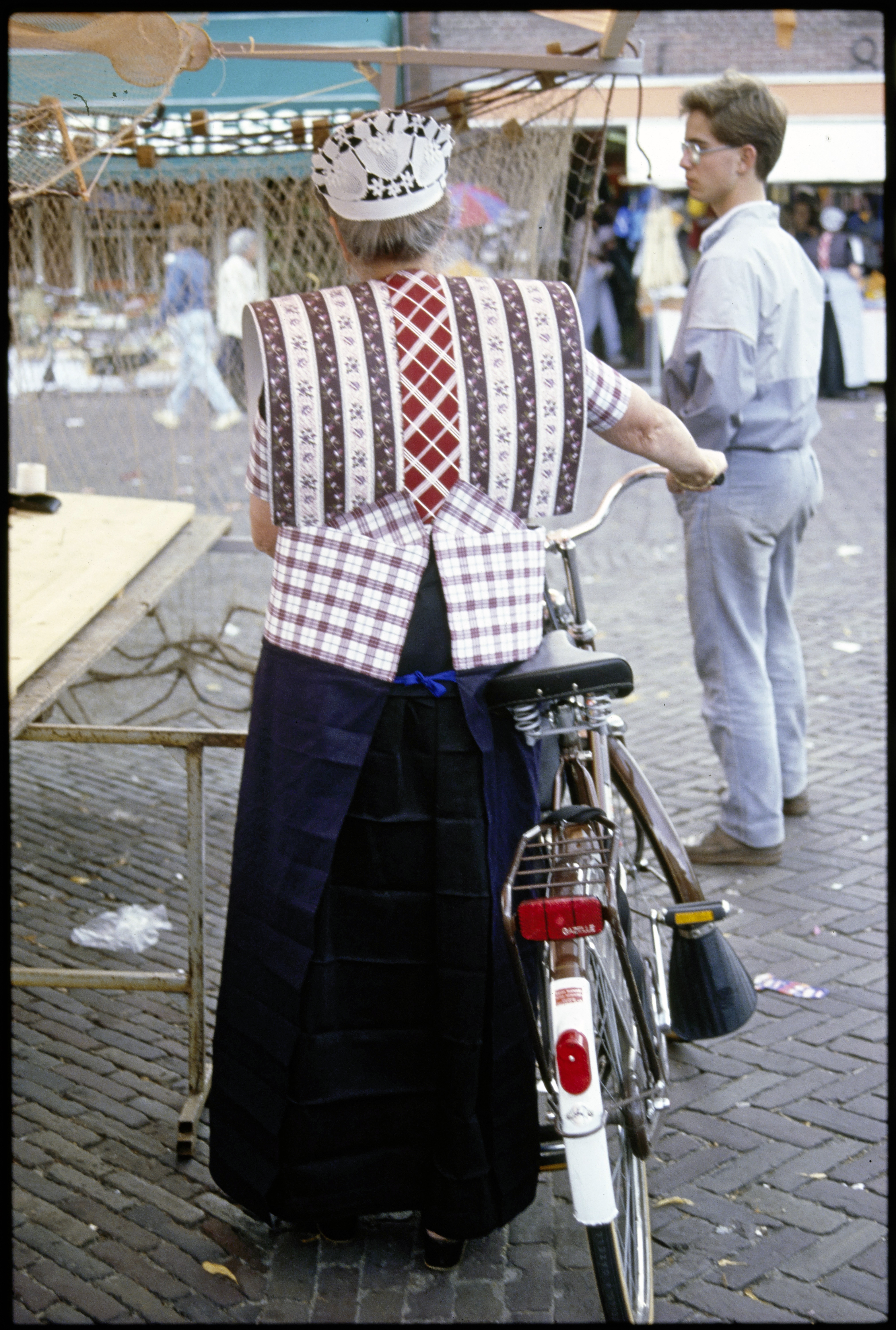 Spakenburger vrouwen in klederdracht van achter gezien