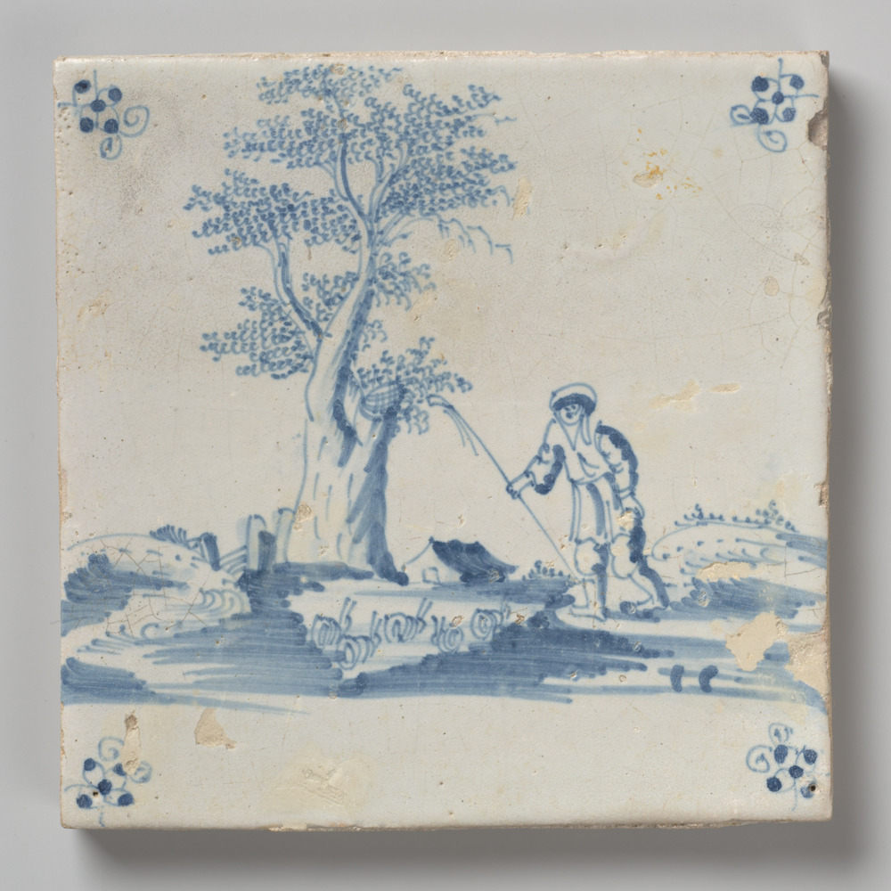 Tegel van keramiek met tinglazuur, voorstellende: wa...