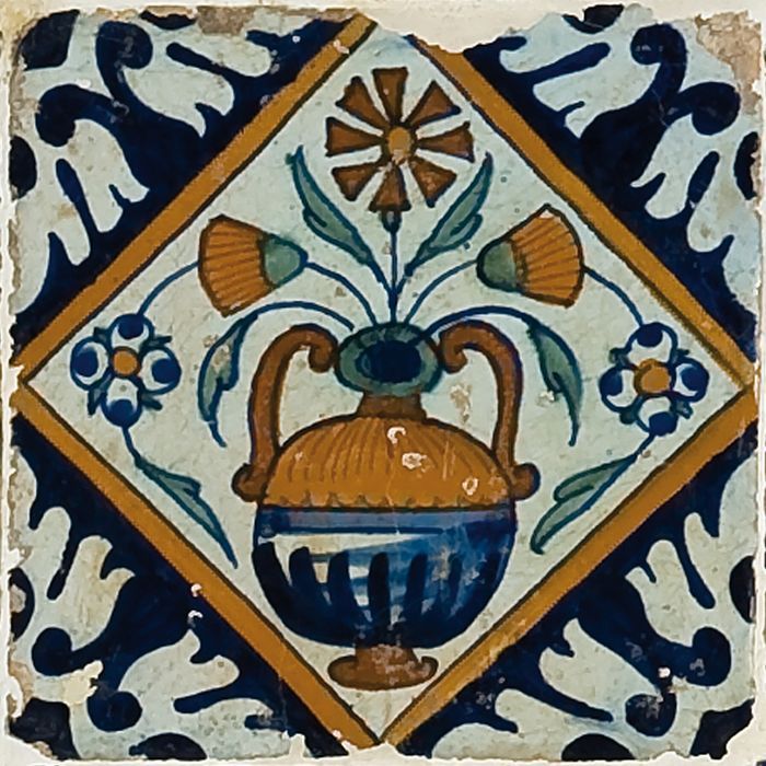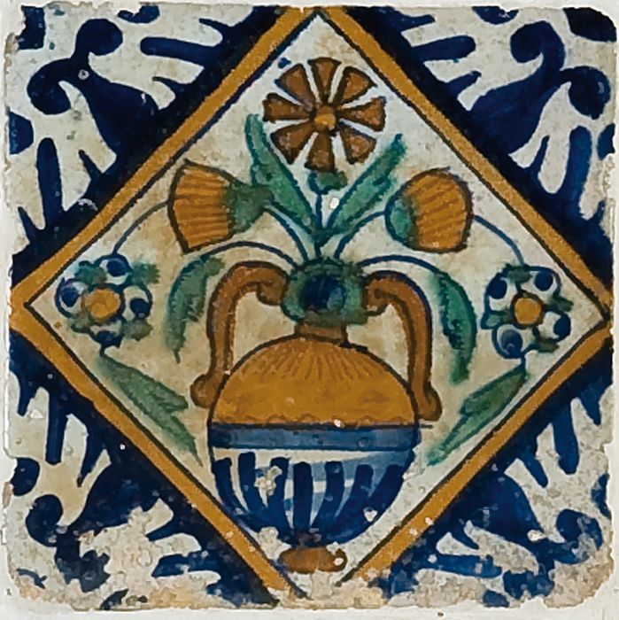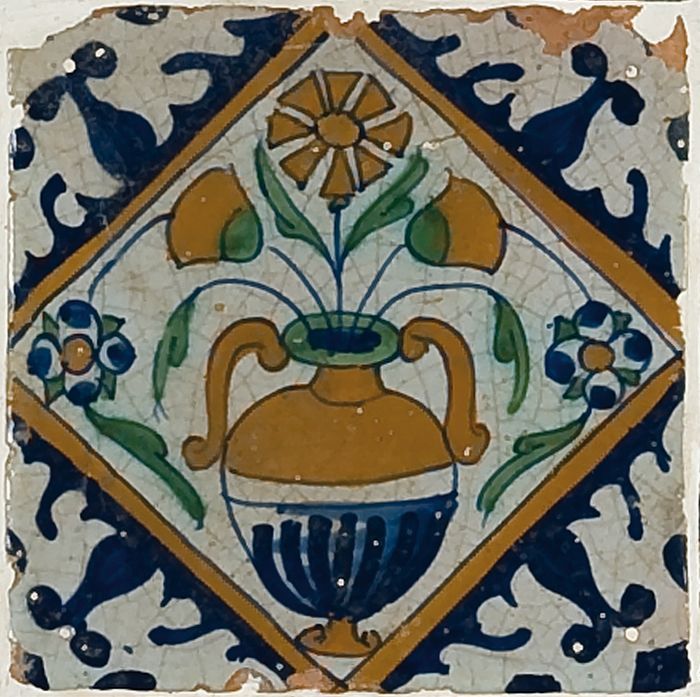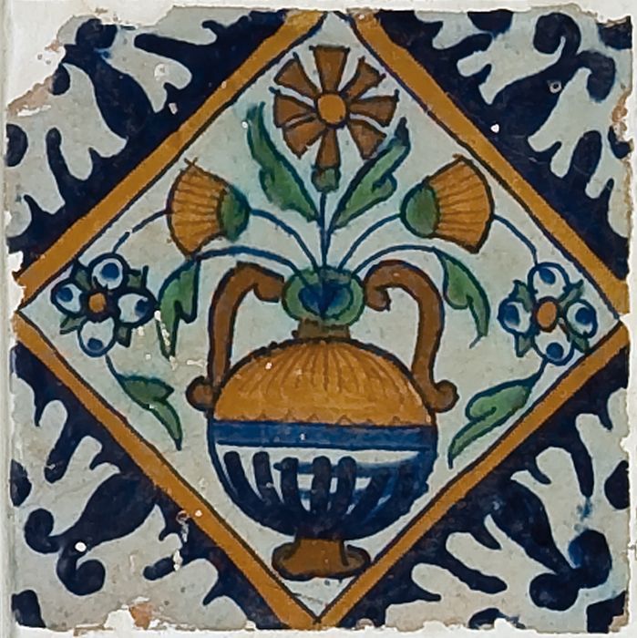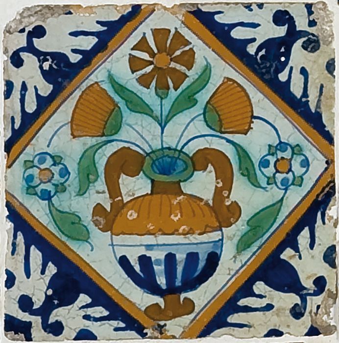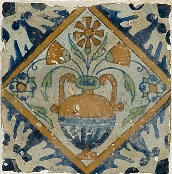 Fragment majolica bord, blauw op wit, vaas met zonne...