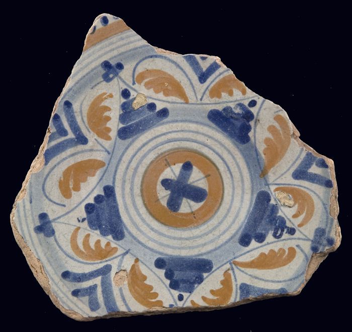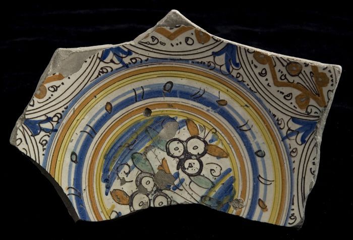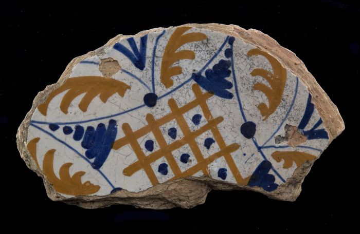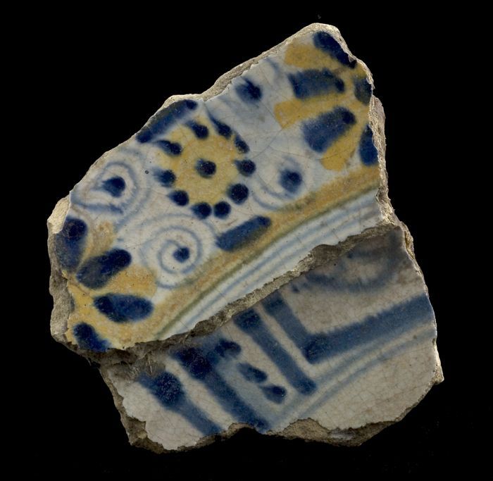 Fragment majolica bord, geel en blauw op wit, vereen...