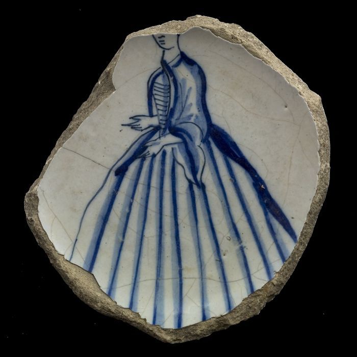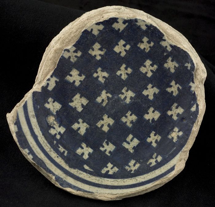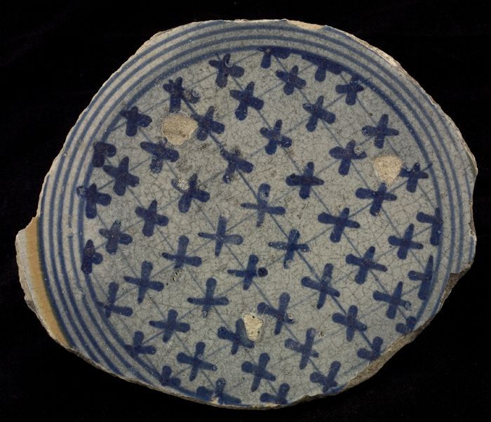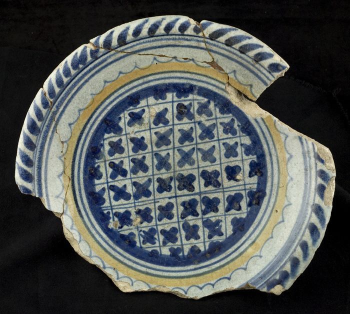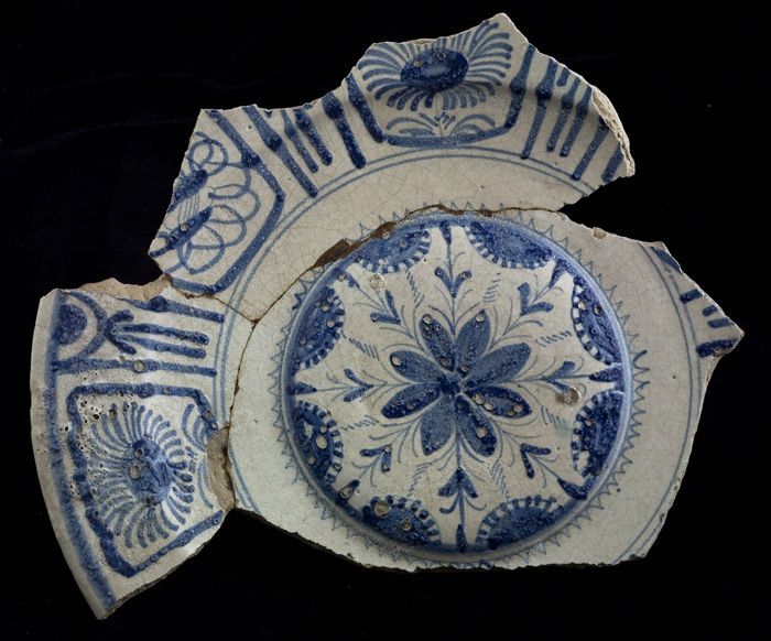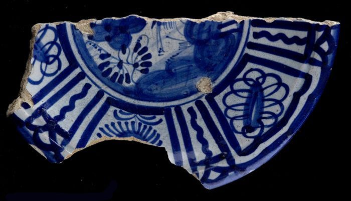 Fragmenten van majolica schotel, blauw op wit, Chine...