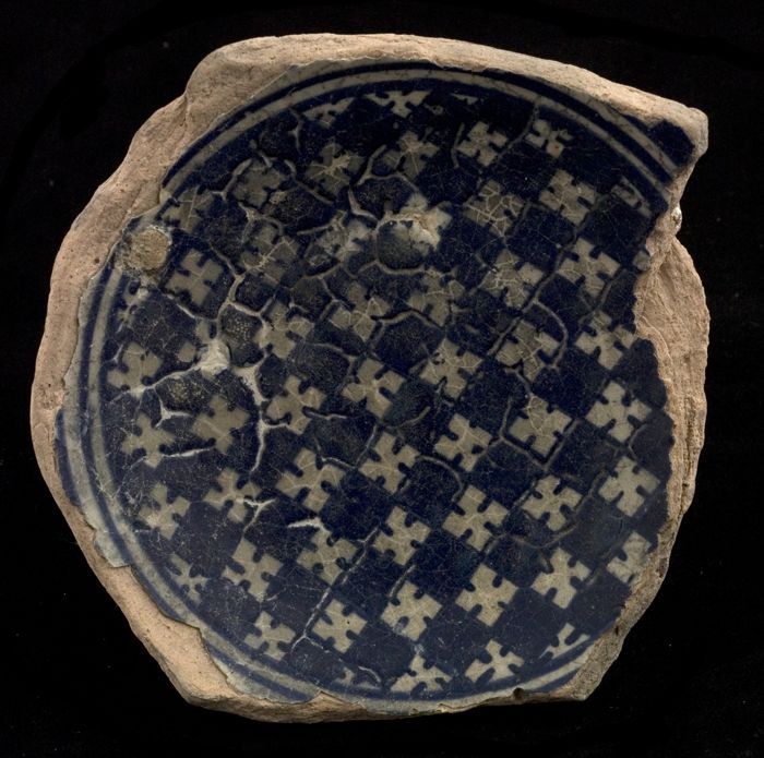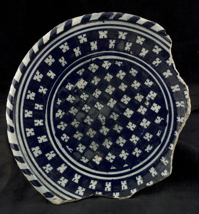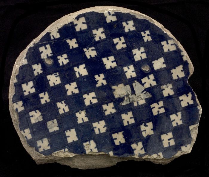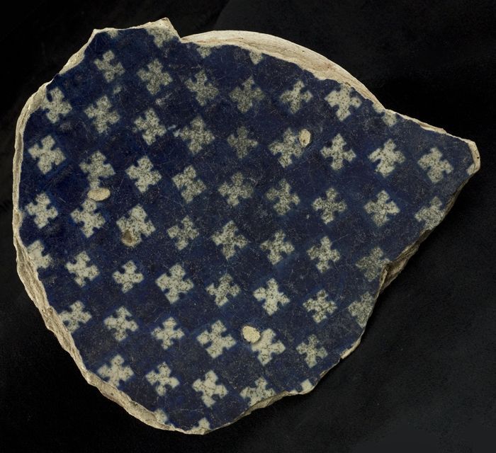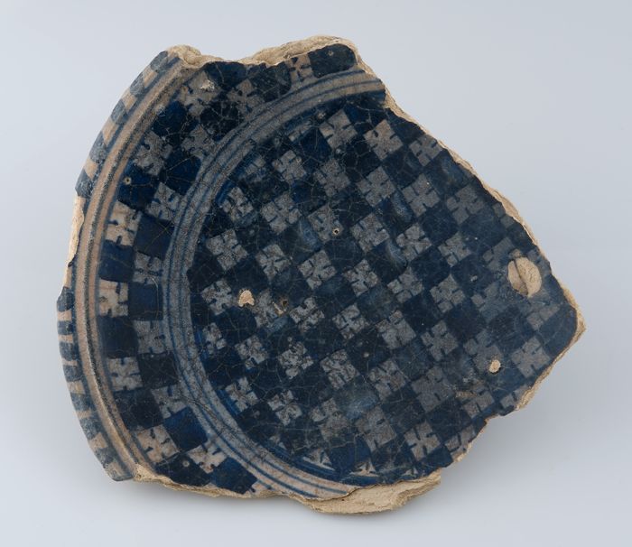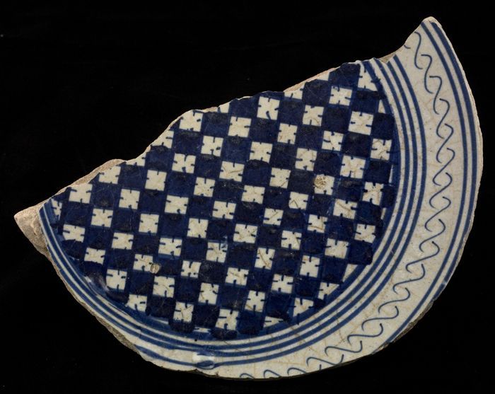 Fragment majolica bord, blauw op wit, schaakborddecor