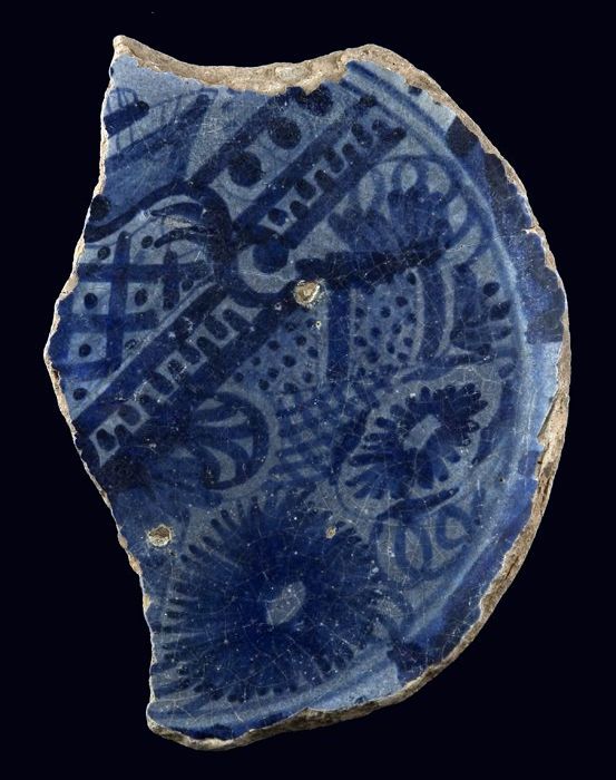Fragment majolica bord, zeer plat model, blauw op wi...
