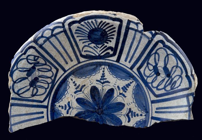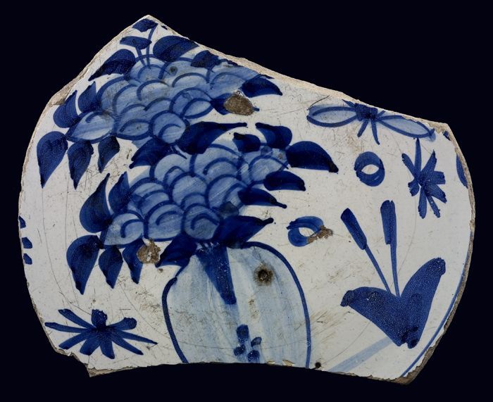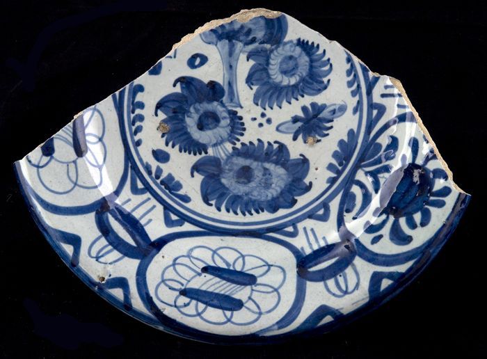Fragment majolica schotel, blauw op wit, bloemenvaas...