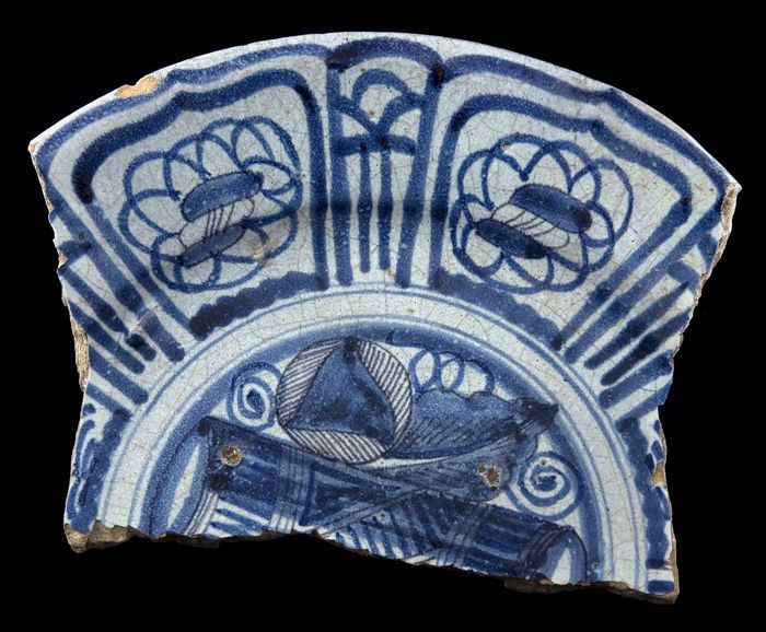 Fragment majolica zoutschaal, blauw op wit, decor Ch...