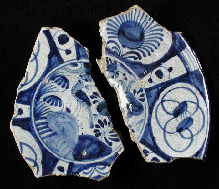 Twee fragmenten van majolica schotel, blauw op wit, ...