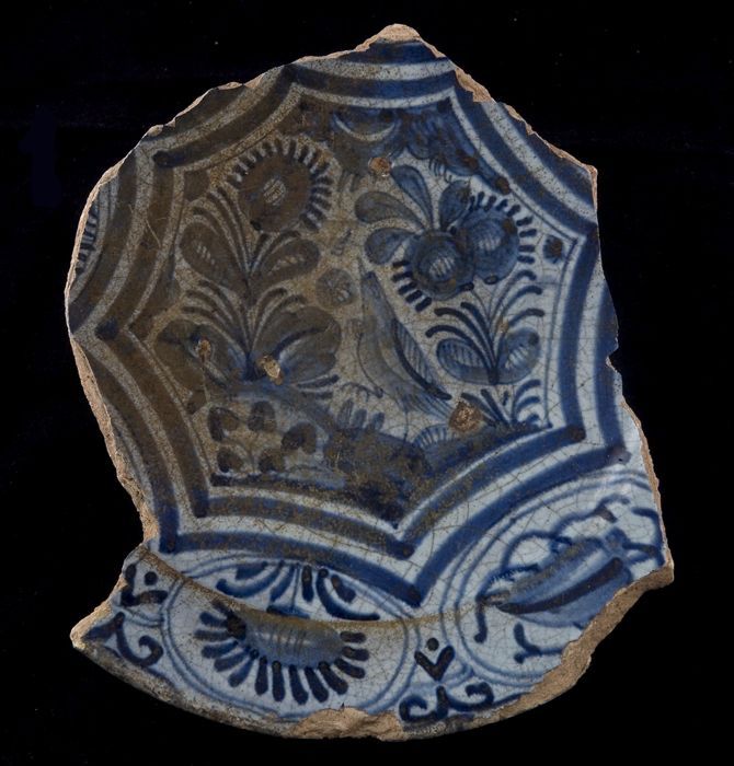 Fragment majolica schotel, blauw op wit, vogel in Ch...