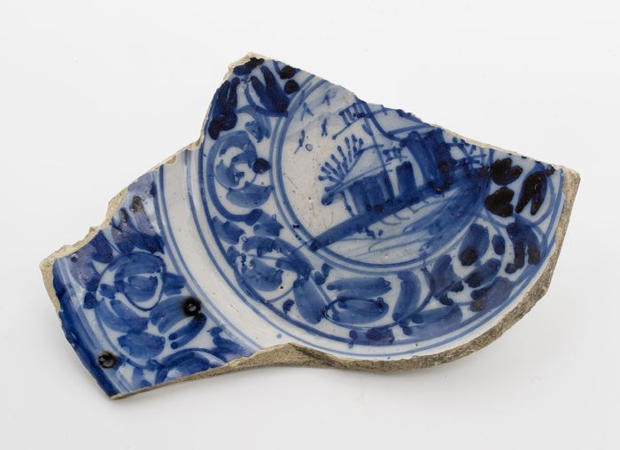 Fragment majolica bord, blauw op wit, Chinees decor ...
