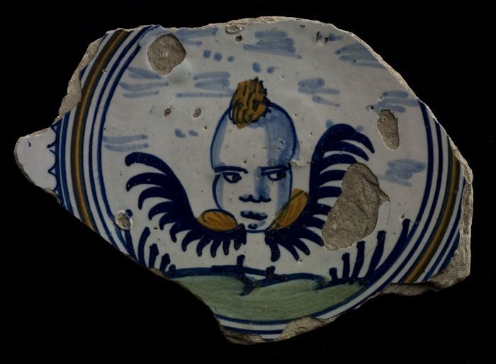 Fragment majolica bord, polychroom, gevleugelde cher...