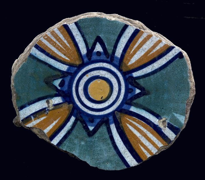 Fragment majolica schotel, groen, oranje, geel en bl...