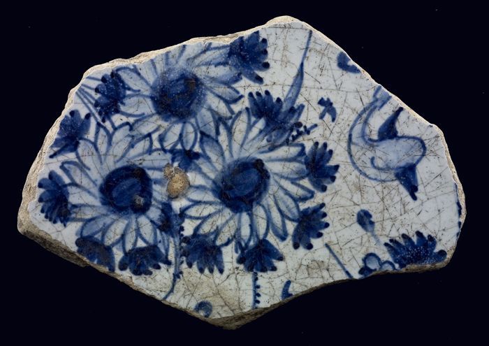Fragment majolica schotel, blauw op wit, bloemen in ...