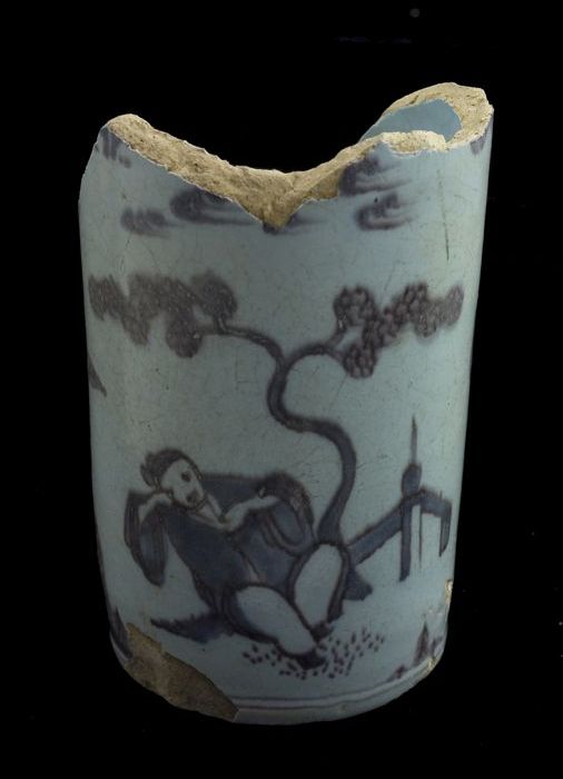Fragment majolica schotel, blauw op wit, Chinese tui...