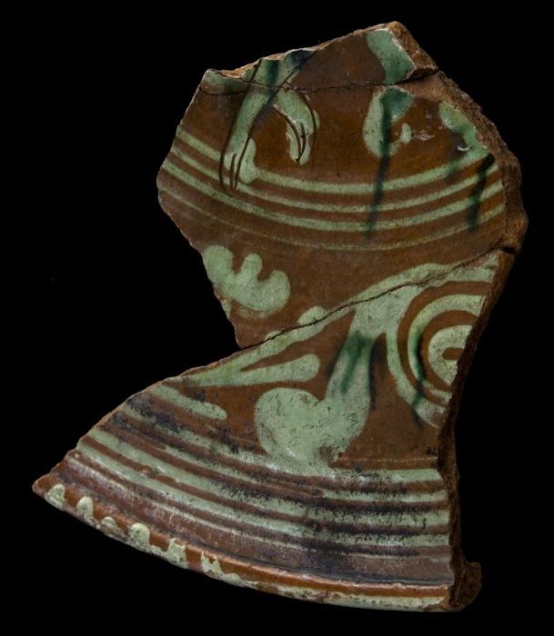 Fragment aardewerken kom, in bruine tinten gemarmerd