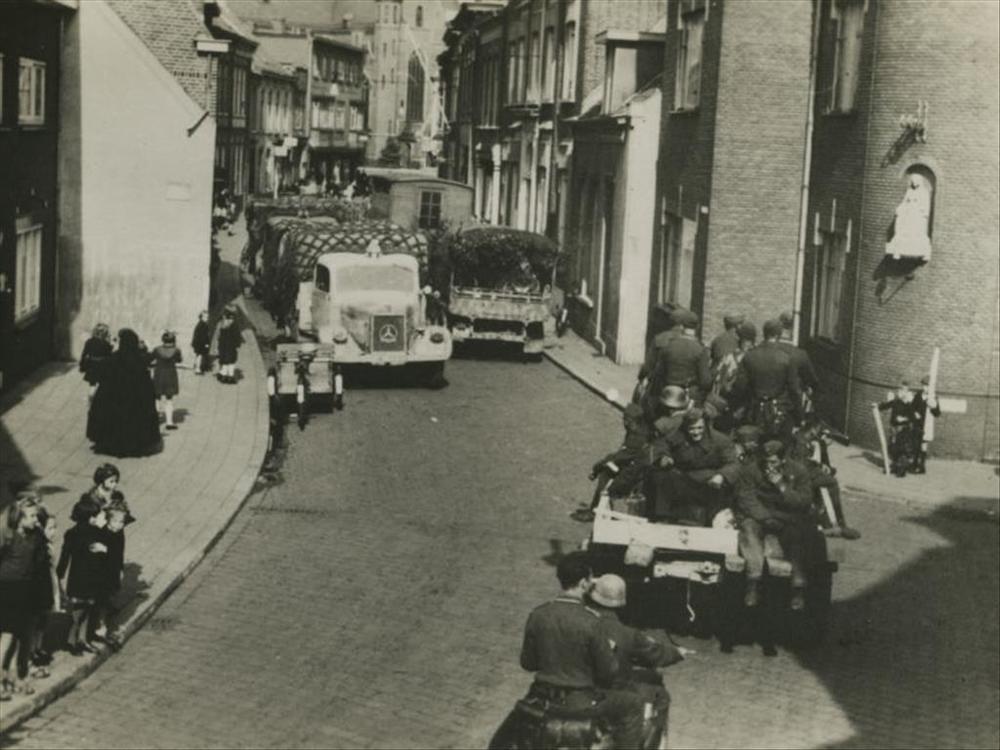 Foto van terugtrekkende Duitse voertuigen in Nederla...