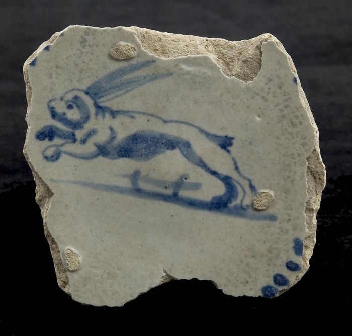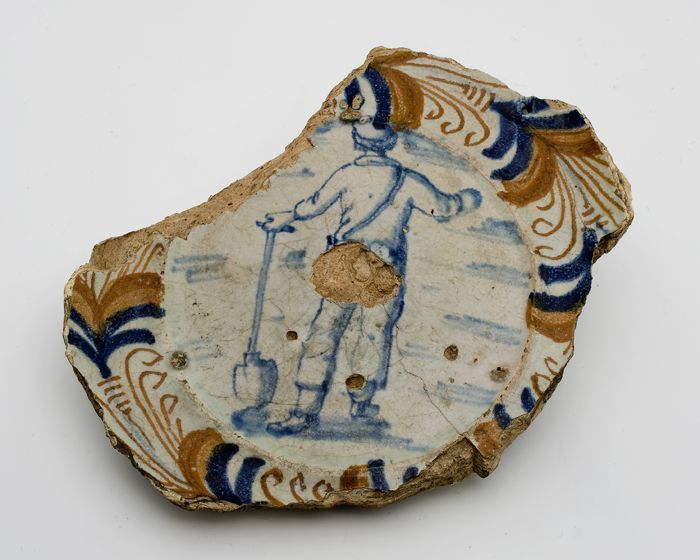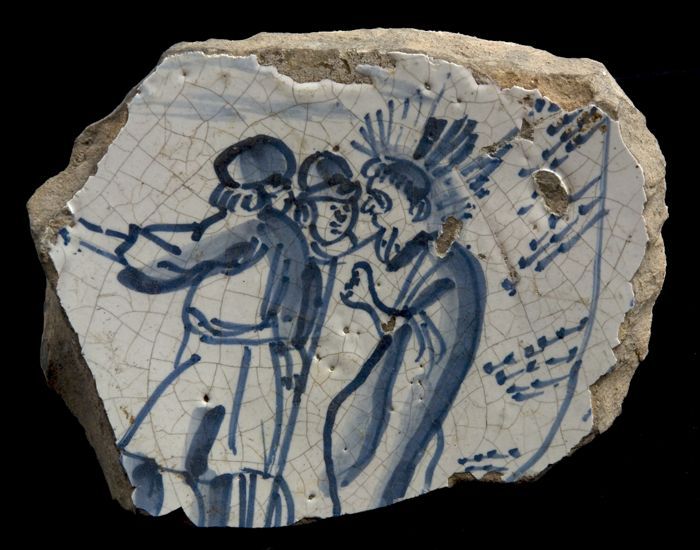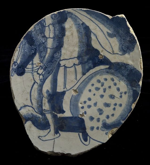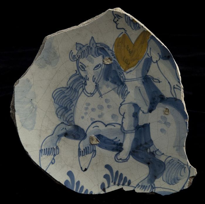 Fragment majolica bord, blauw op wit, ruiter op een ...