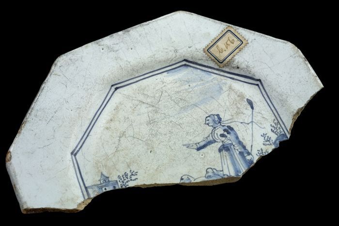 Fragment achthoekig faience bord, blauw op wit, herd...