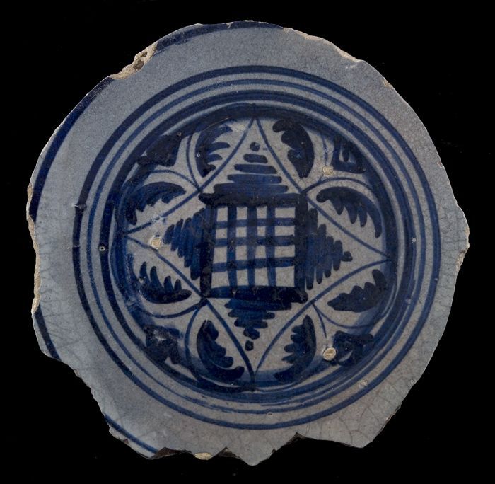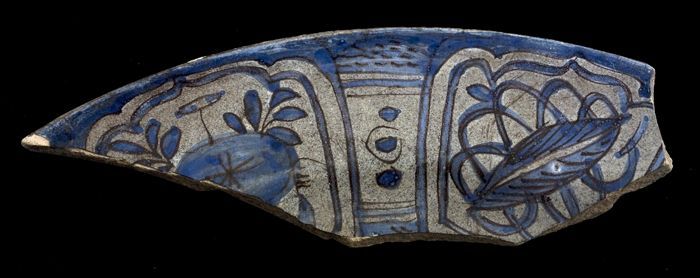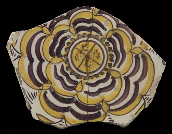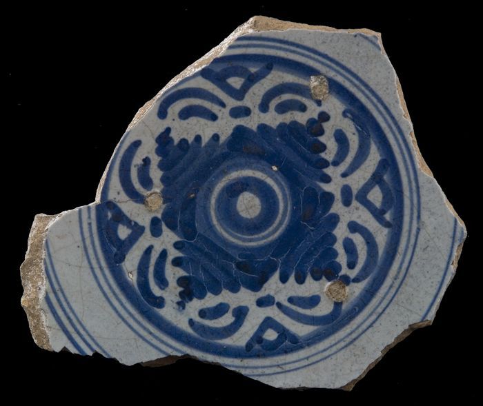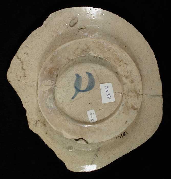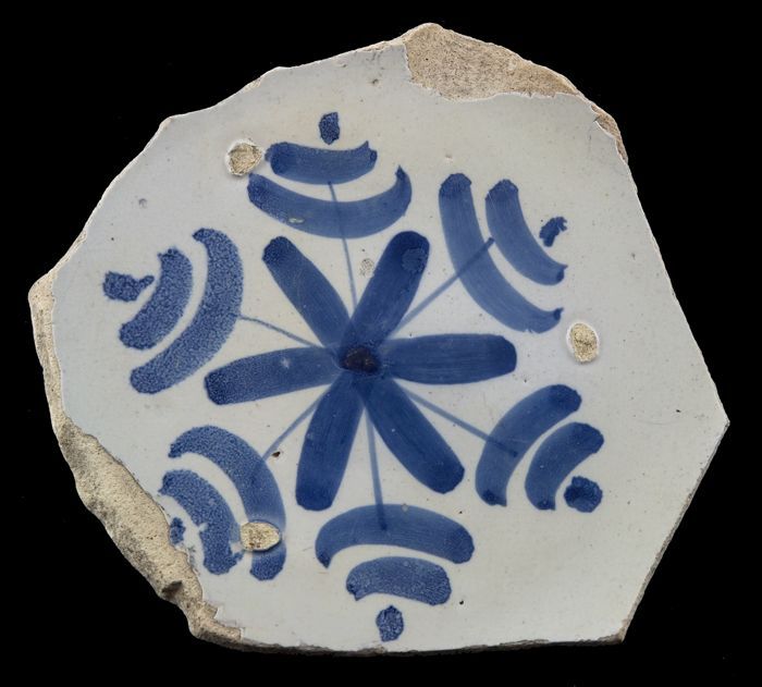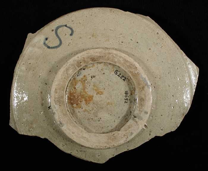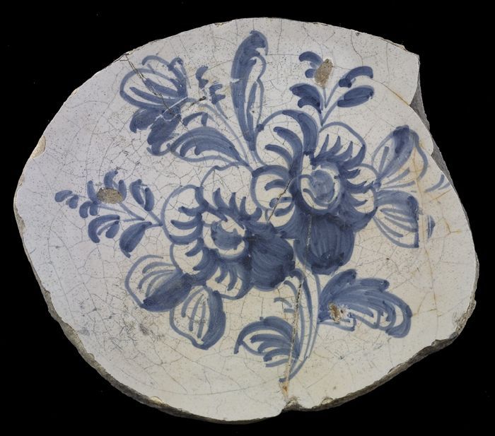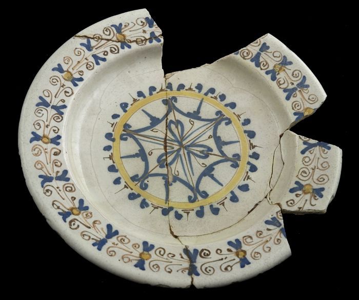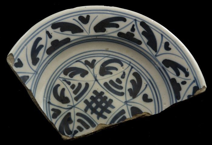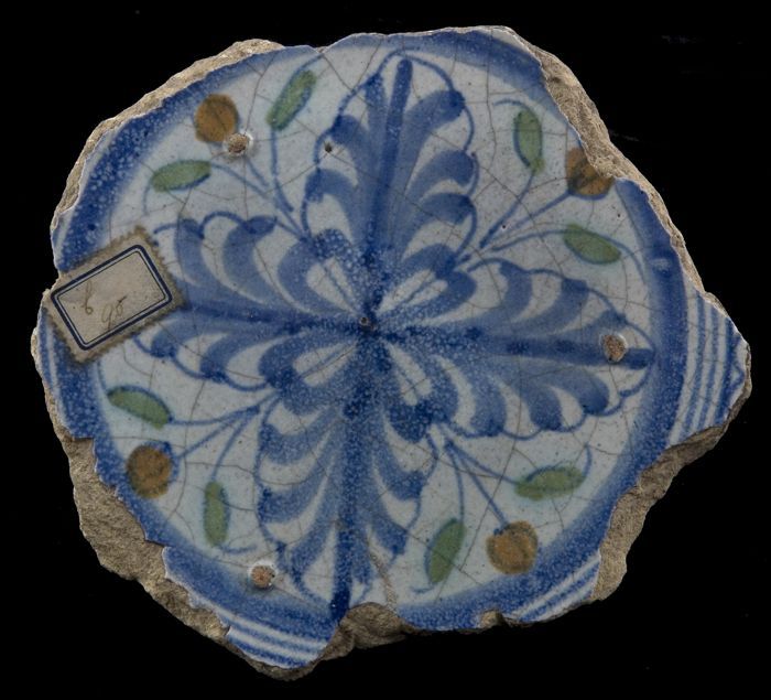 Fragmenten van majolica schaal, mangaan en blauw op ...
