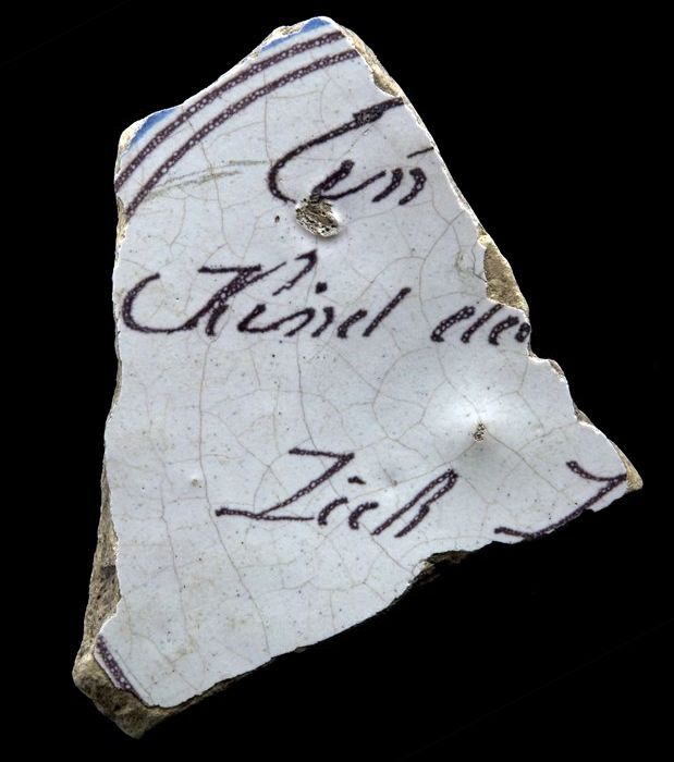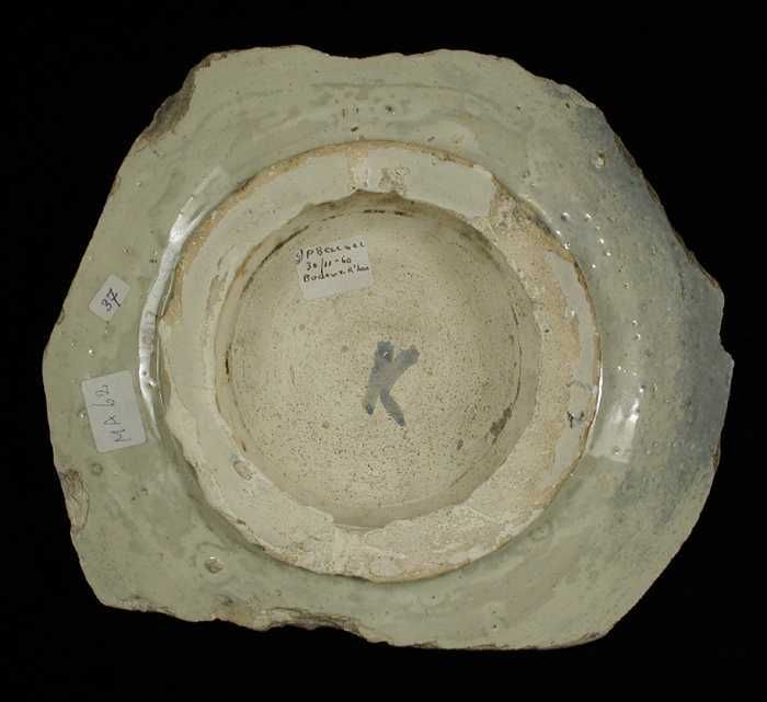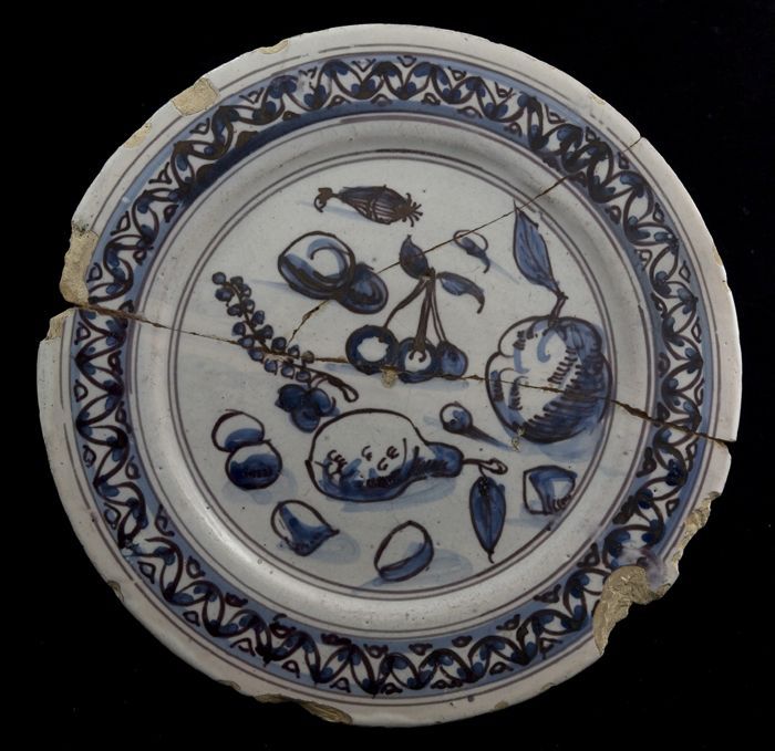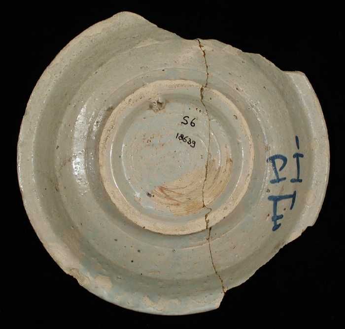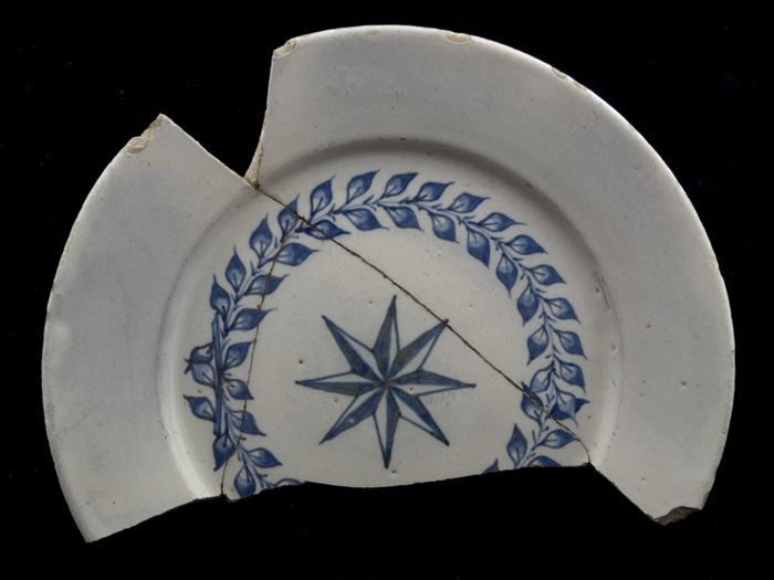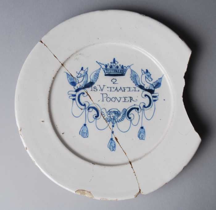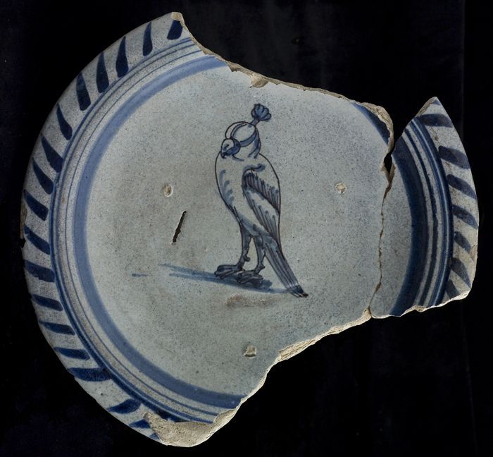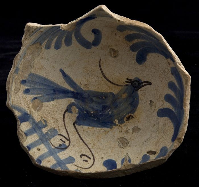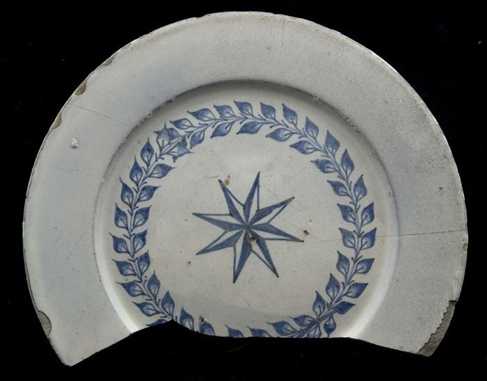 Fragmenten van majolica schaal, mangaan en blauw op ...
