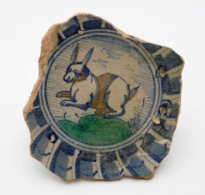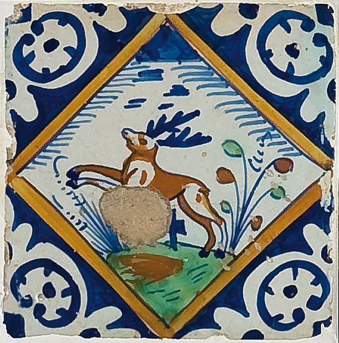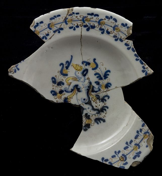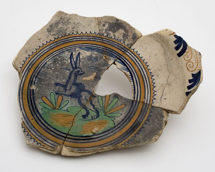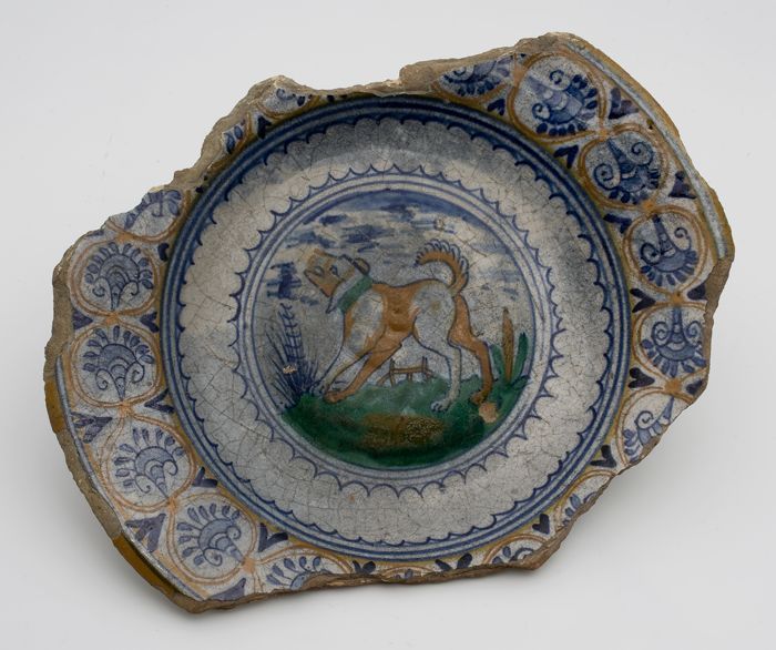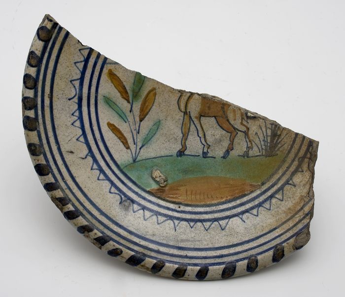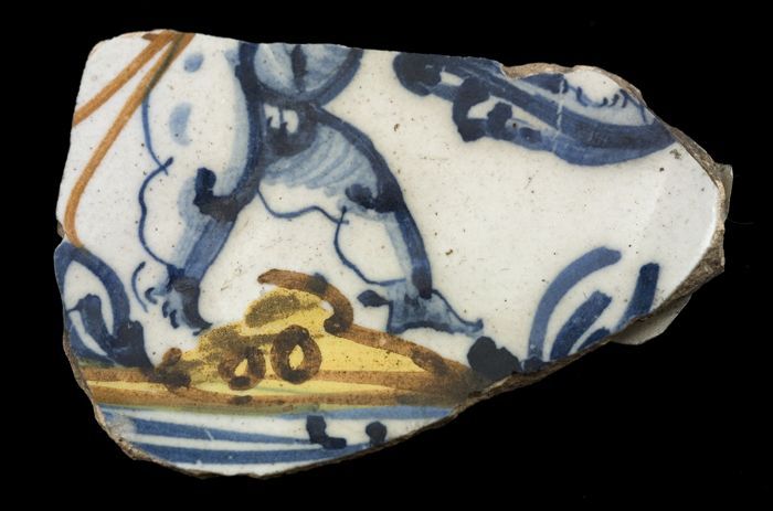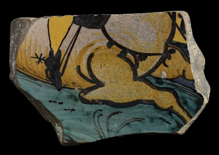 Fragment majolica schotel, polychroom, lopend hoefdi...