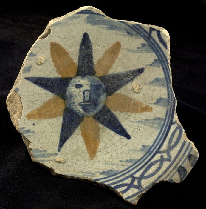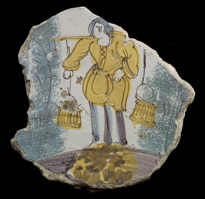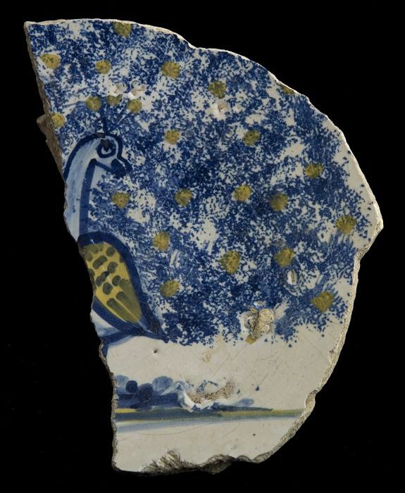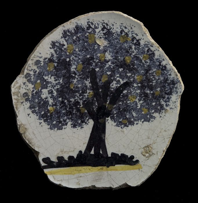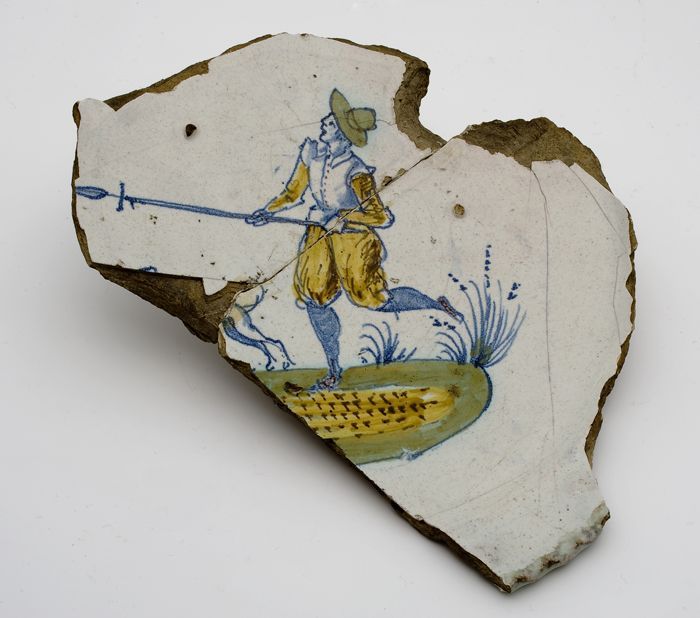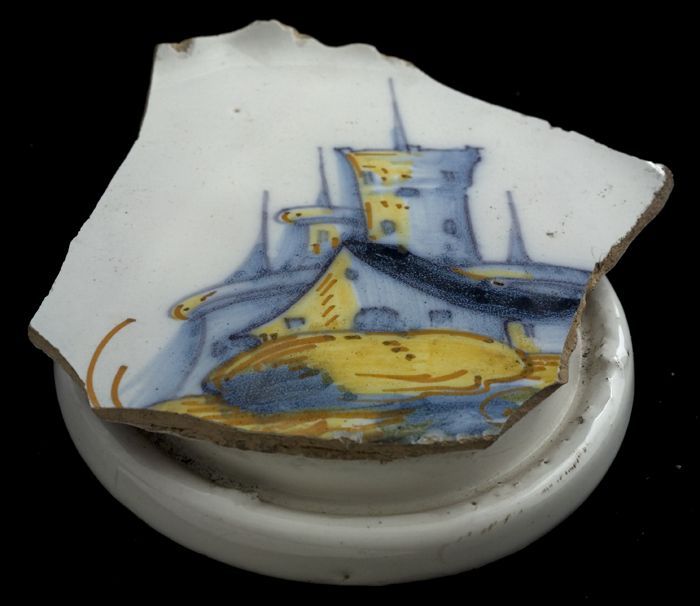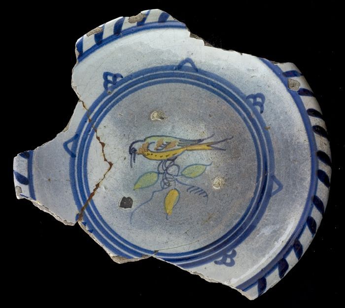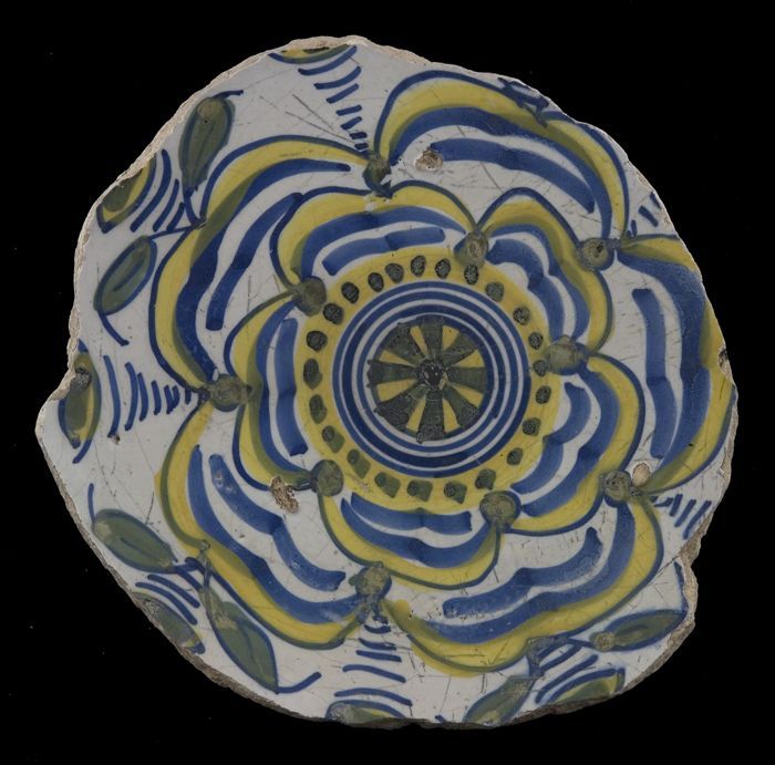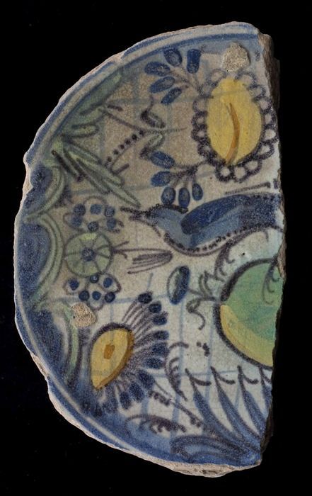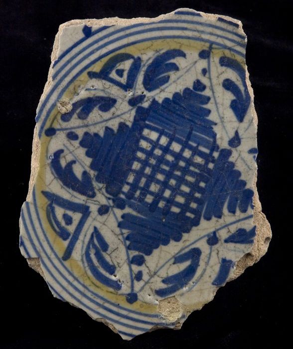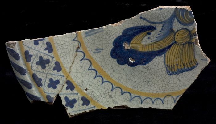 Fragment majolica schotel, geel en blauw op wit, tro...