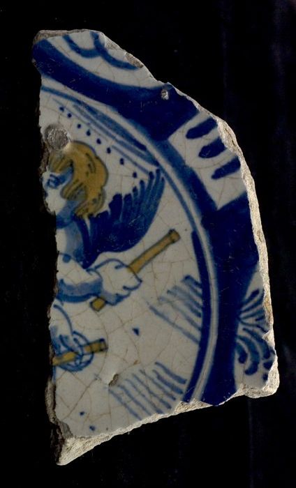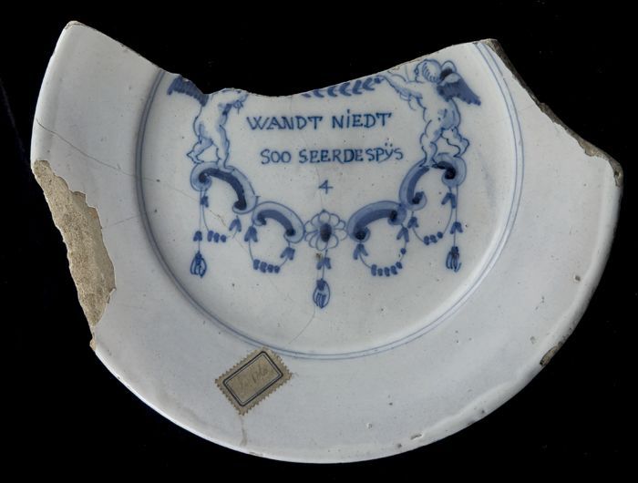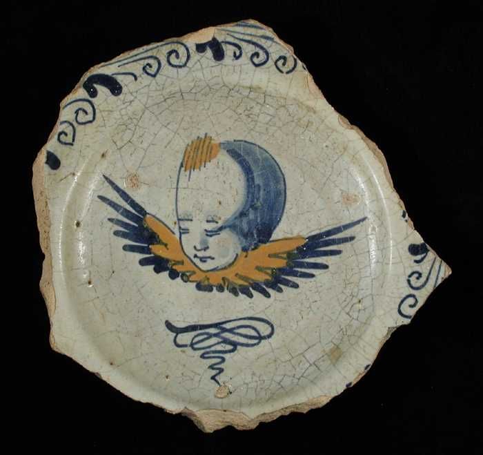 Fragment faience bord, blauw op wit, cherubijn of pu...