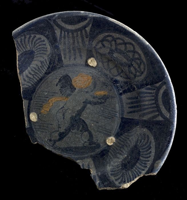 Fragment majolica schotel, polychroom, zwevende Amor...